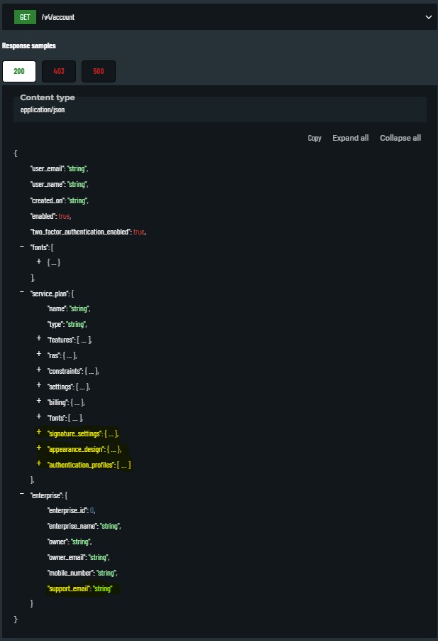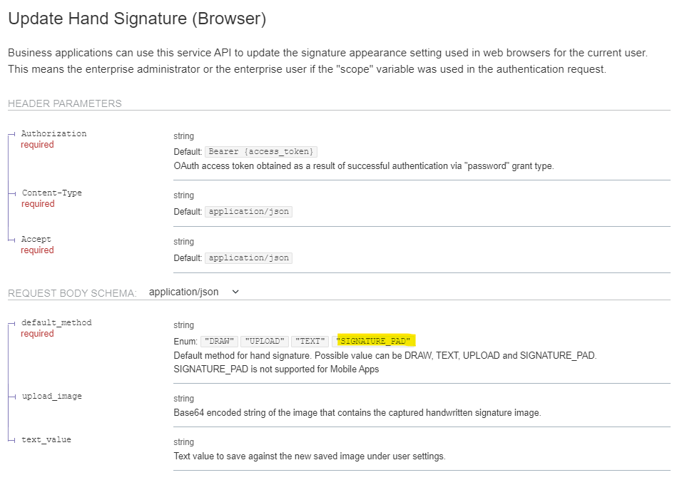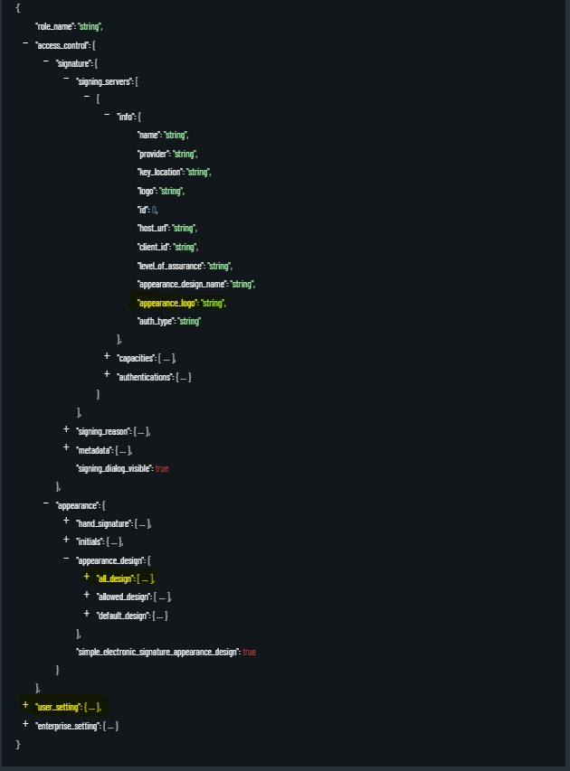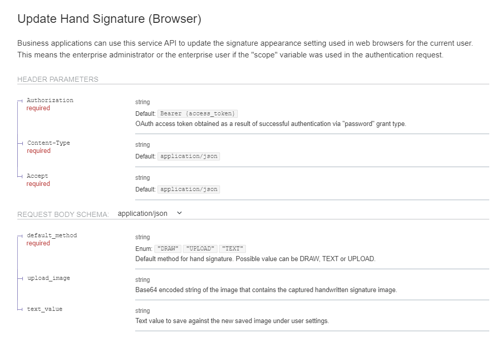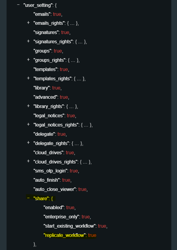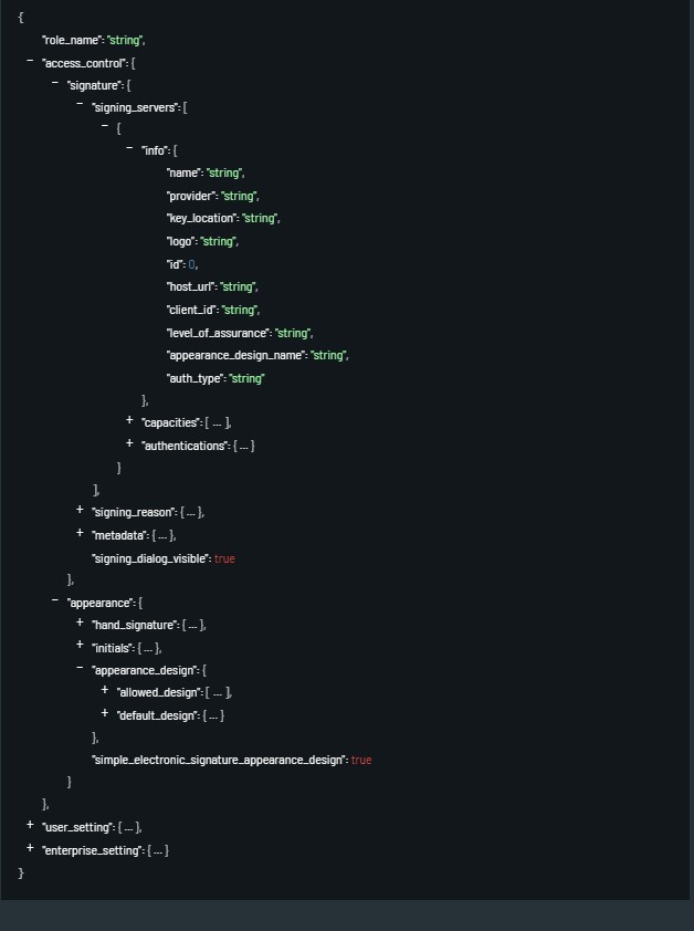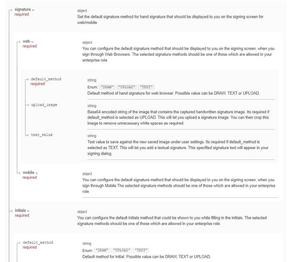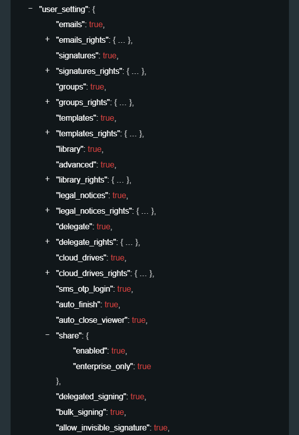 | features required | Array of strings (PLAN_FEATURES) Items Enum: "ALLOW_FORM_FIELDS" "ALLOW_REVIEWER" "ALLOW_ATTACHMENTS" "ALLOW_INITIALS_FIELDS" "ALLOW_INPERSON_FIELDS" "ALLOW_INTEGRATION" "ALLOW_BULK_SIGNING" "SERVICE_PLAN_FEATURE_CLOUD_DRIVES" "ALLOW_EDITOR" "ALLOW_SEND_A_COPY" "ALLOW_ELECTRONIC_SEAL" "ALLOW_DOCUMENTS_ARCHIVE" List of features available in the service plan, possible values are mentioned above.ALLOW_ELECTRONIC_SEAL and ALLOW_INTEGRATION can be updated only to the "Enterprise" service plan. |