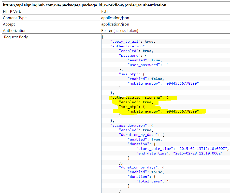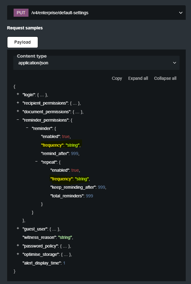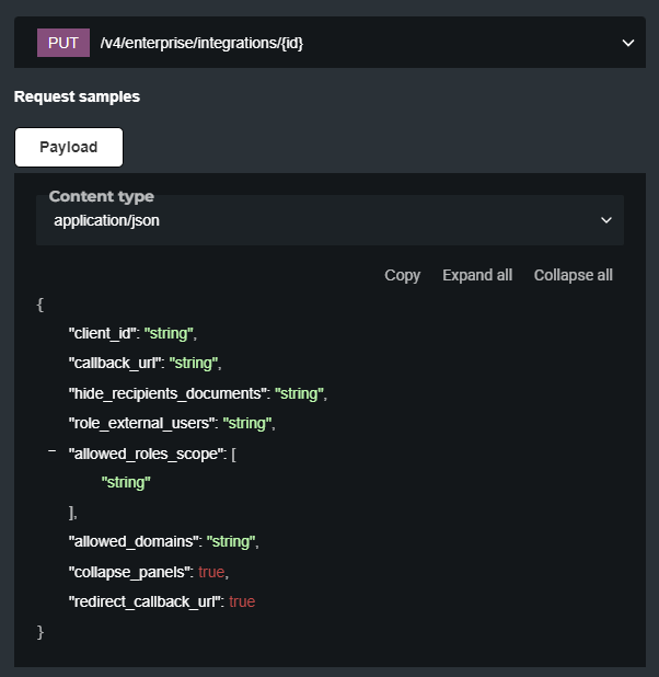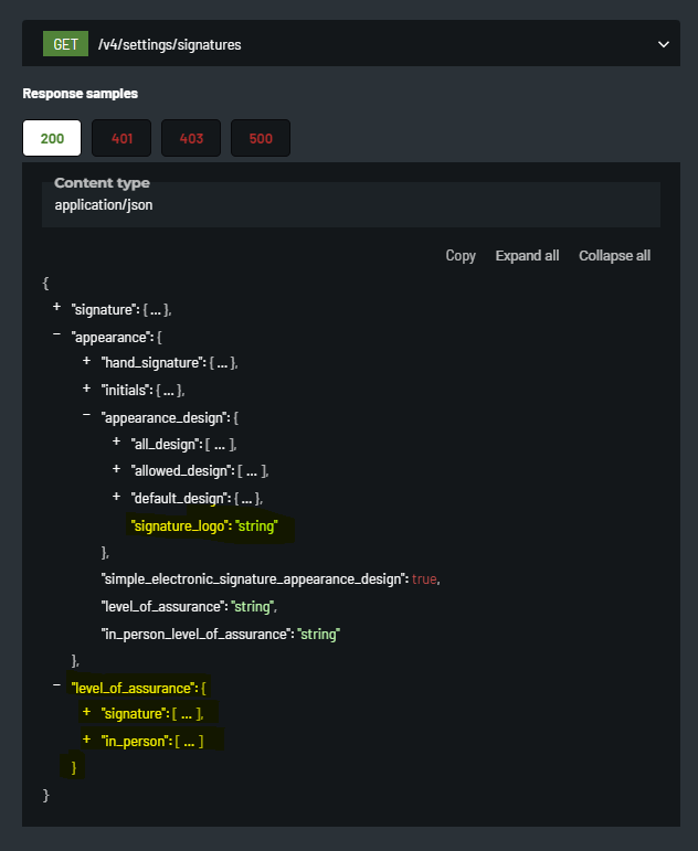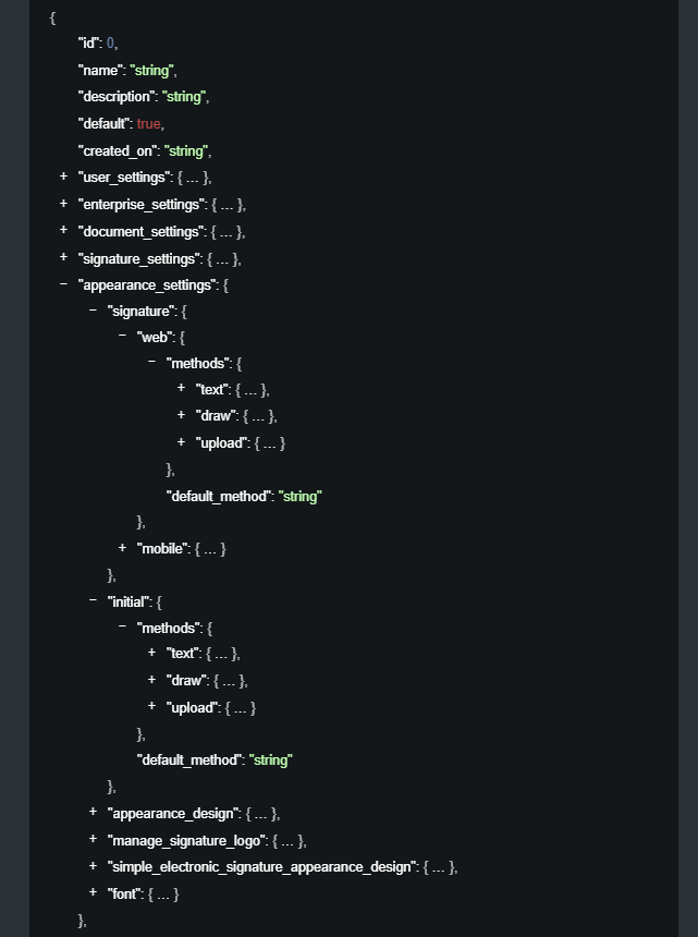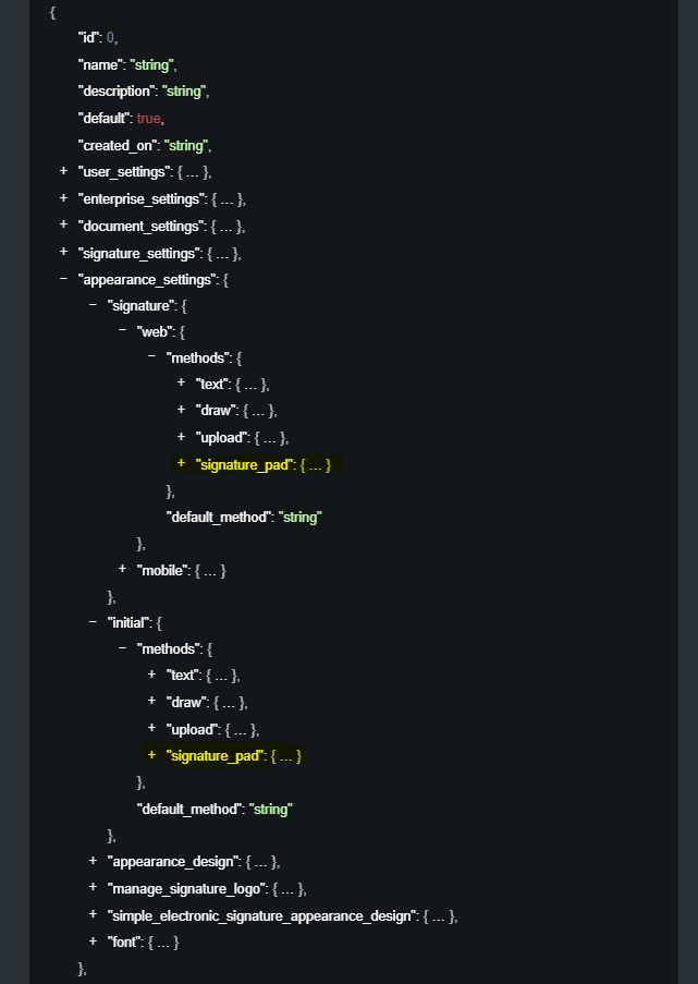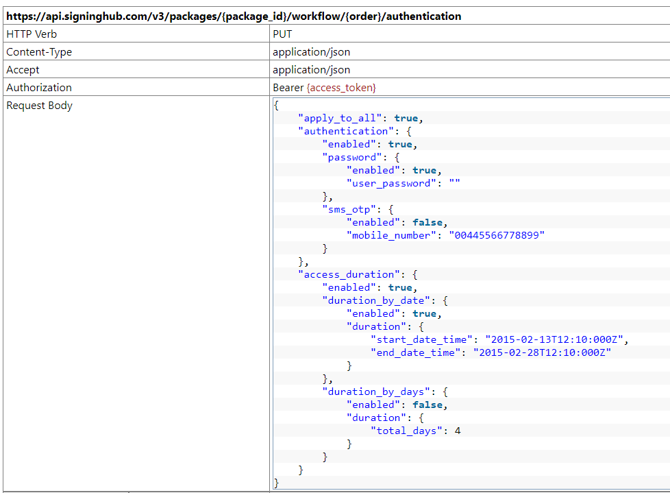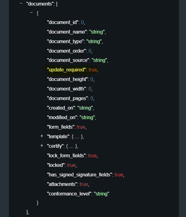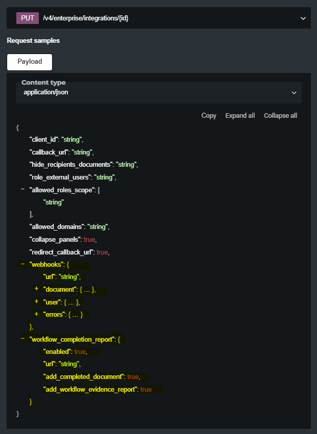 | features required | Array of strings (PLAN_FEATURES) Items Enum: "ALLOW_FORM_FIELDS" "ALLOW_REVIEWER" "ALLOW_ATTACHMENTS" "ALLOW_INITIALS_FIELDS" "ALLOW_INPERSON_FIELDS" "ALLOW_INTEGRATION" "ALLOW_BULK_SIGNING" "SERVICE_PLAN_FEATURE_CLOUD_DRIVES" "ALLOW_EDITOR" "ALLOW_SEND_A_COPY" "ALLOW_ELECTRONIC_SEAL" "ALLOW_DOCUMENTS_ARCHIVE" List of features available in the service plan, possible values are mentioned above.ALLOW_ELECTRONIC_SEAL and ALLOW_INTEGRATION can be updated only to the "Enterprise" service plan. |