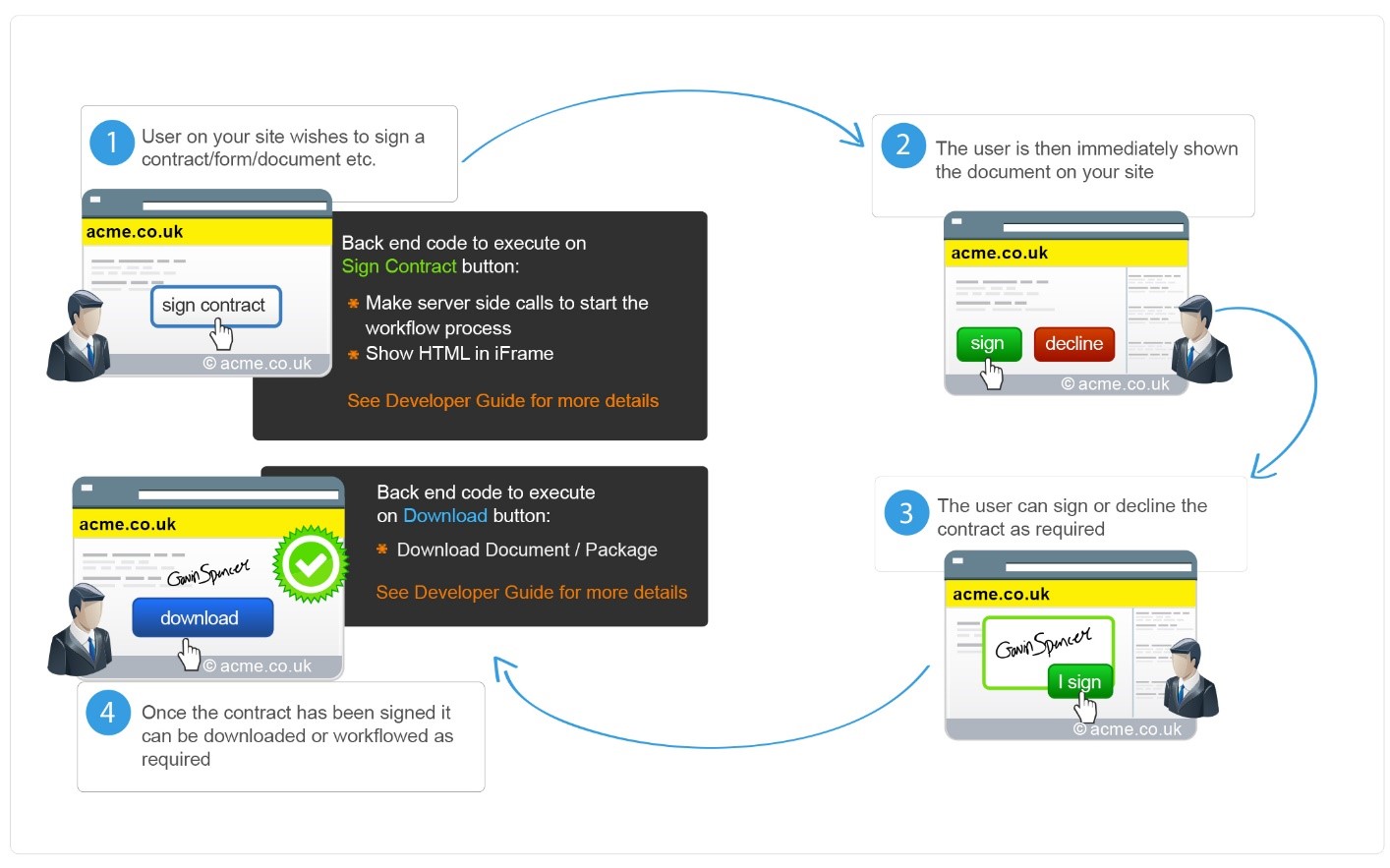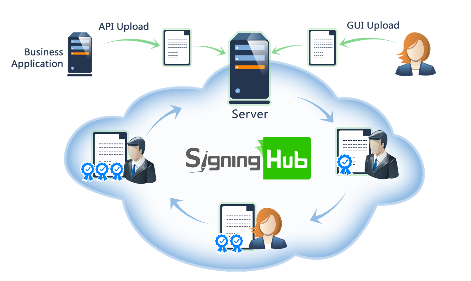 SigningHub exposes an external communication channel that allows external business applications to authenticate themselves, send requests and receive responses. This integration can be done with an on-premise instance (or private cloud instance) or the public cloud service running here www.signinghub.com.