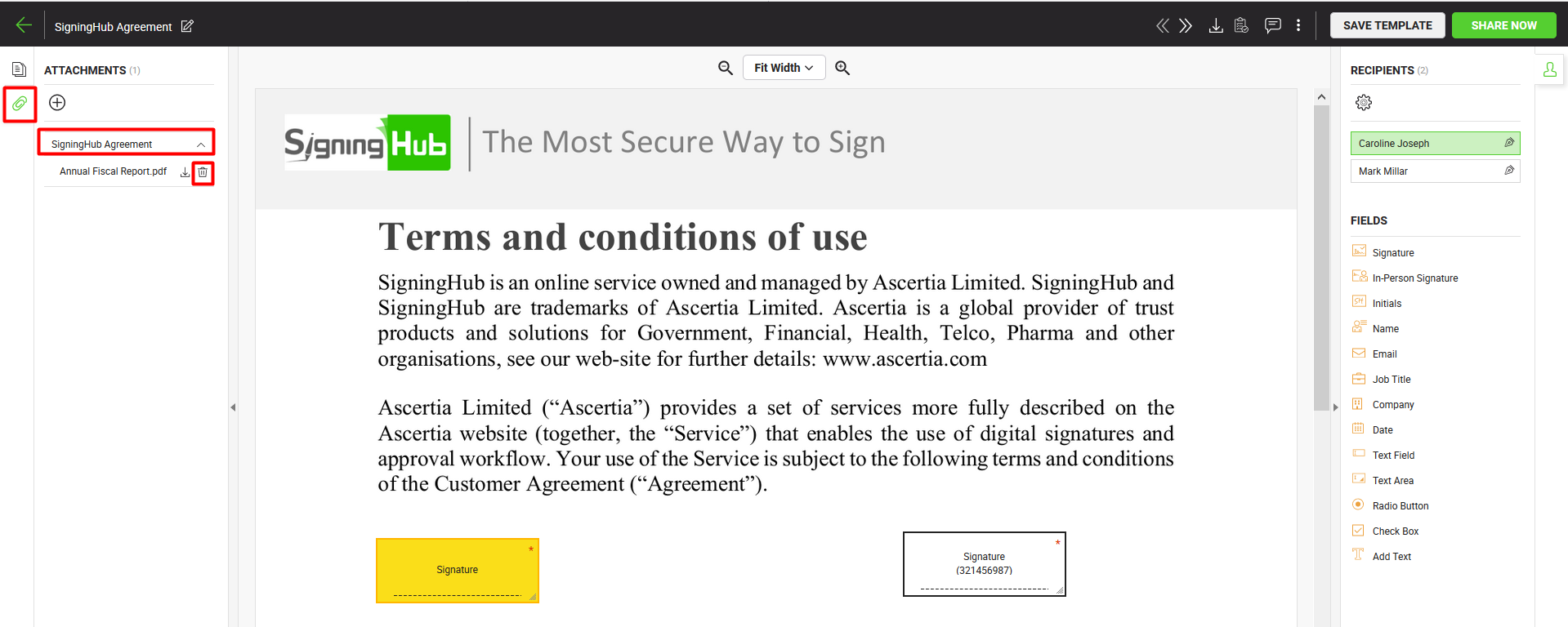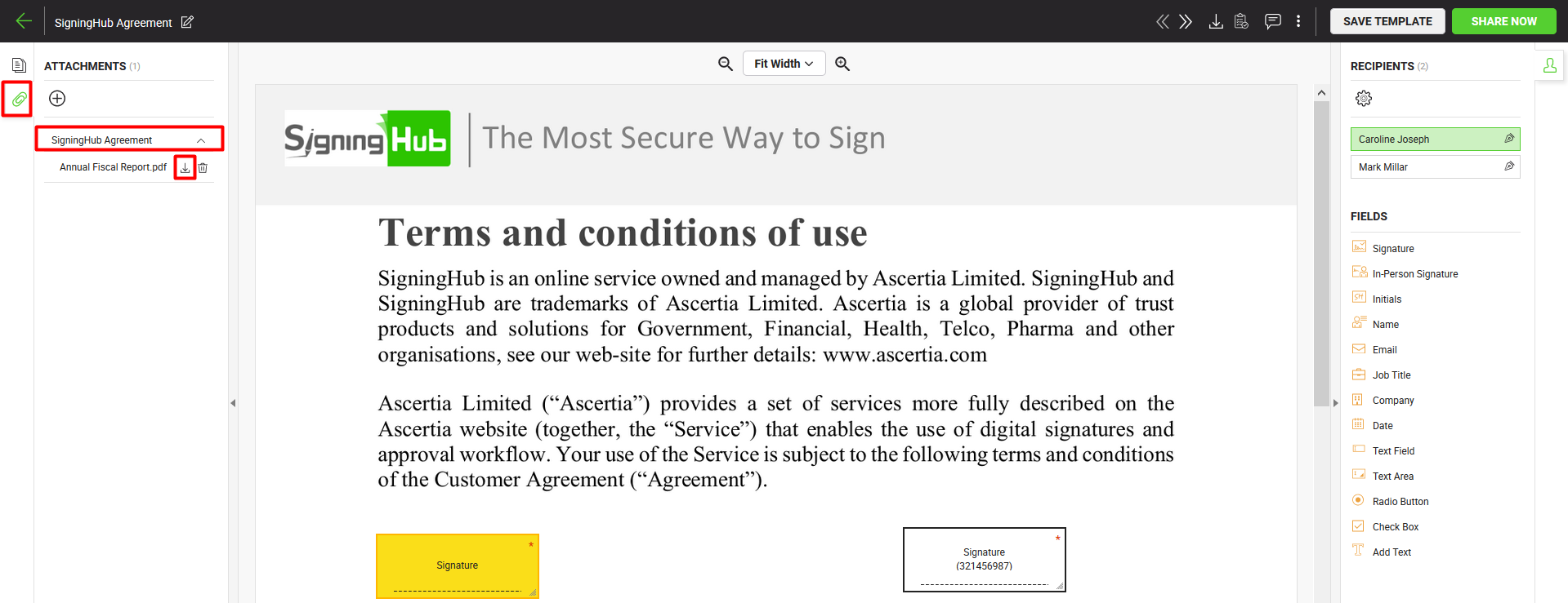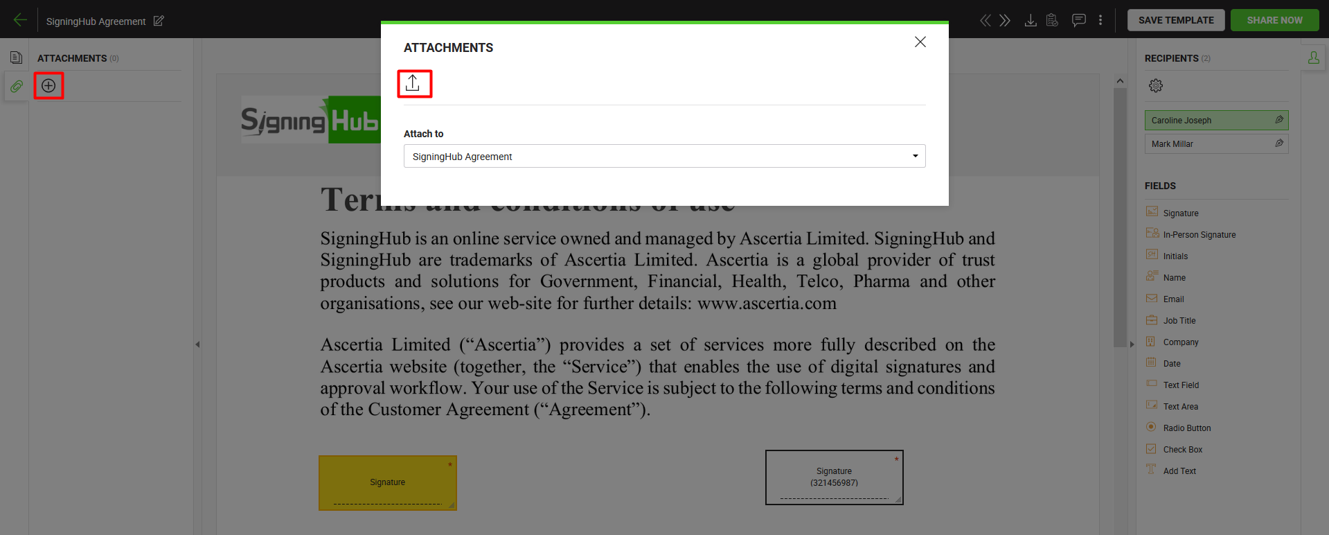 SigningHub allows you to add attachments in your workflow documents. An attachment can be any supported type (text, image, multimedia, etc.) of file. The added attachments become the part of document hash in a workflow, and are automatically signed along with the document signing. The recipients can download these attachments upon their signing turn.