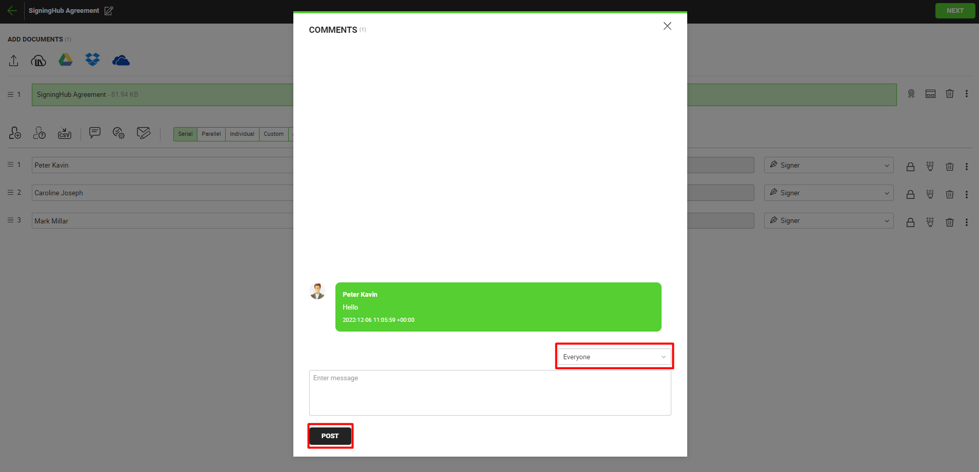 The user has the option to either post a comment for all the configured recipients or for any specific recipient(s). By default, the "Everyone" option is selected in the highlighted drop down menu, to post a comment for all the recipients. To post a private comment for any specific recipient(s), click on the drop down menu and select the recipient(s), for whom you want to post a private comment. When a private comment is sent, a lock icon appears against the comment, indicating that it is a private comment. A private comment will only be visible to the recipient(s), for whom the private comment was posted. - Specify the comment: