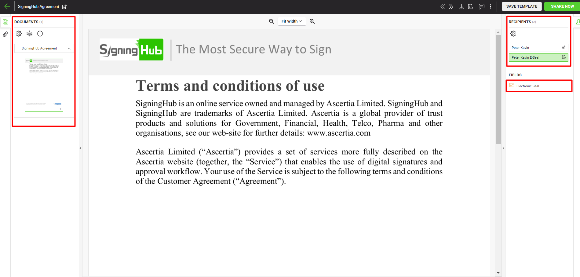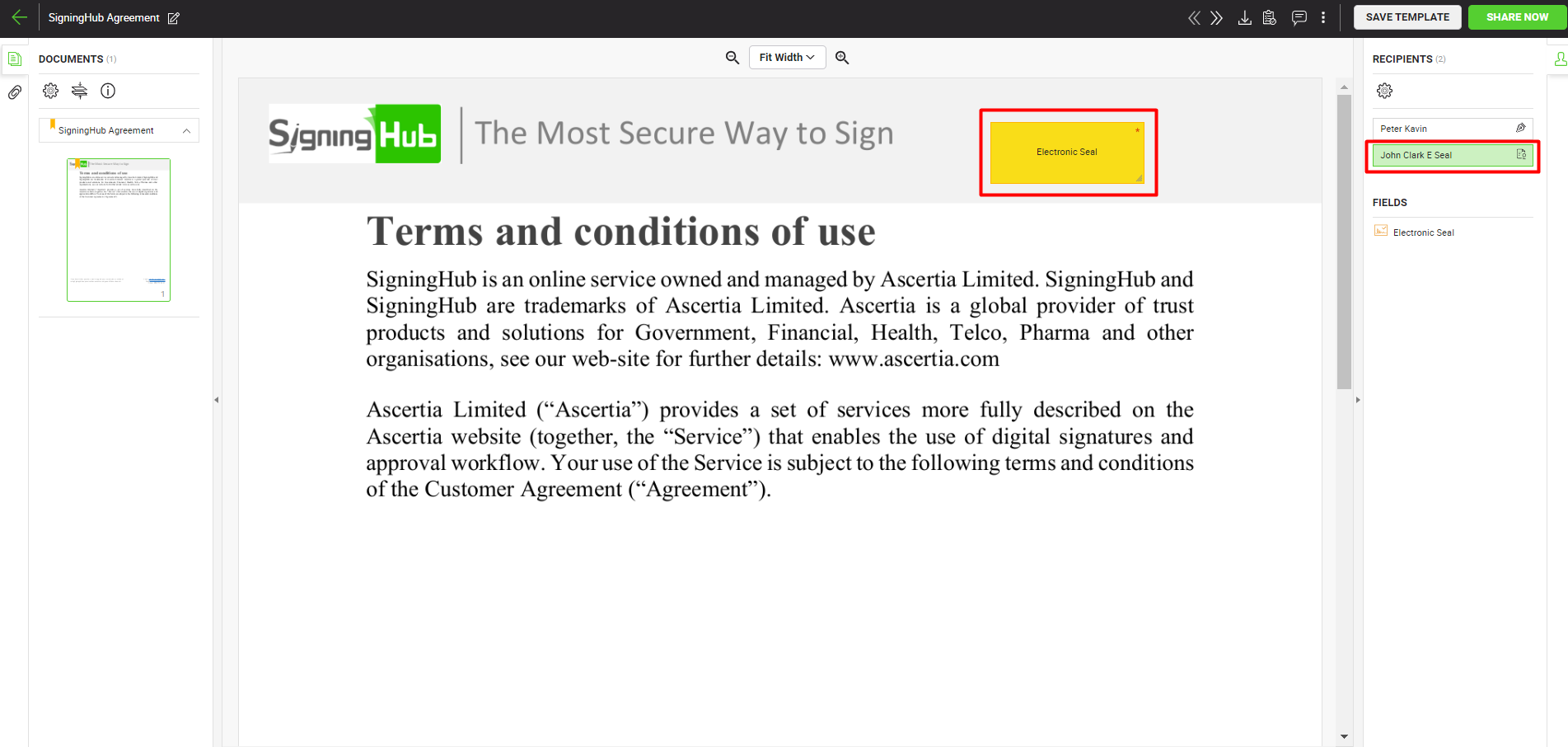 As per the above image, only one electronic seal field is allowed for the electronic seal "John Clark E Seal". To add another electronic seal field for the electronic seal "John Clark E Seal", another electronic seal "John Clark E Seal" will have to be added.