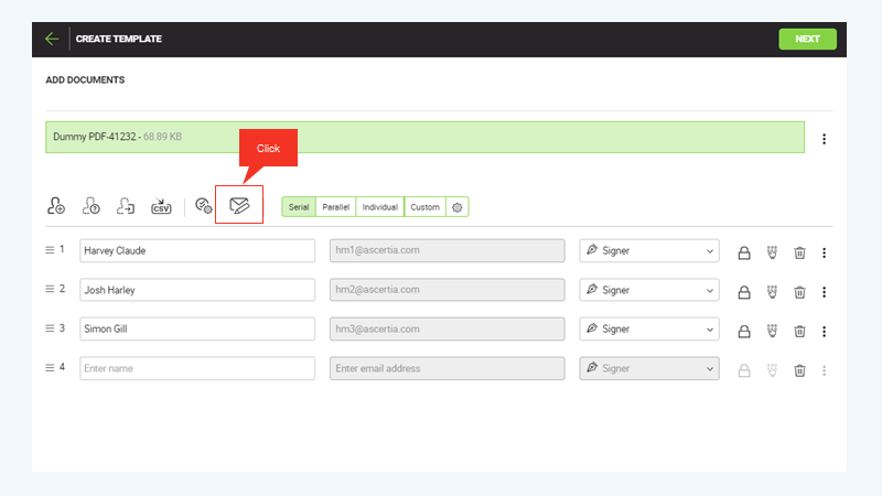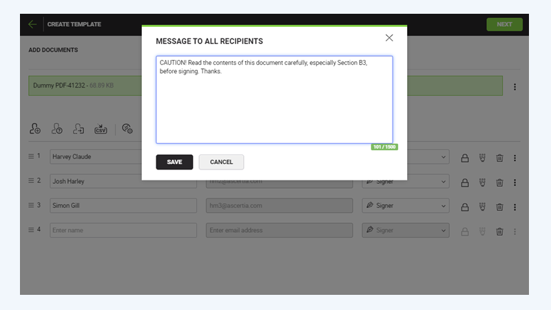 SigningHub also lets you specify a personal email message in a template that will be used to intimate the configured recipients/ placeholders upon their turn.