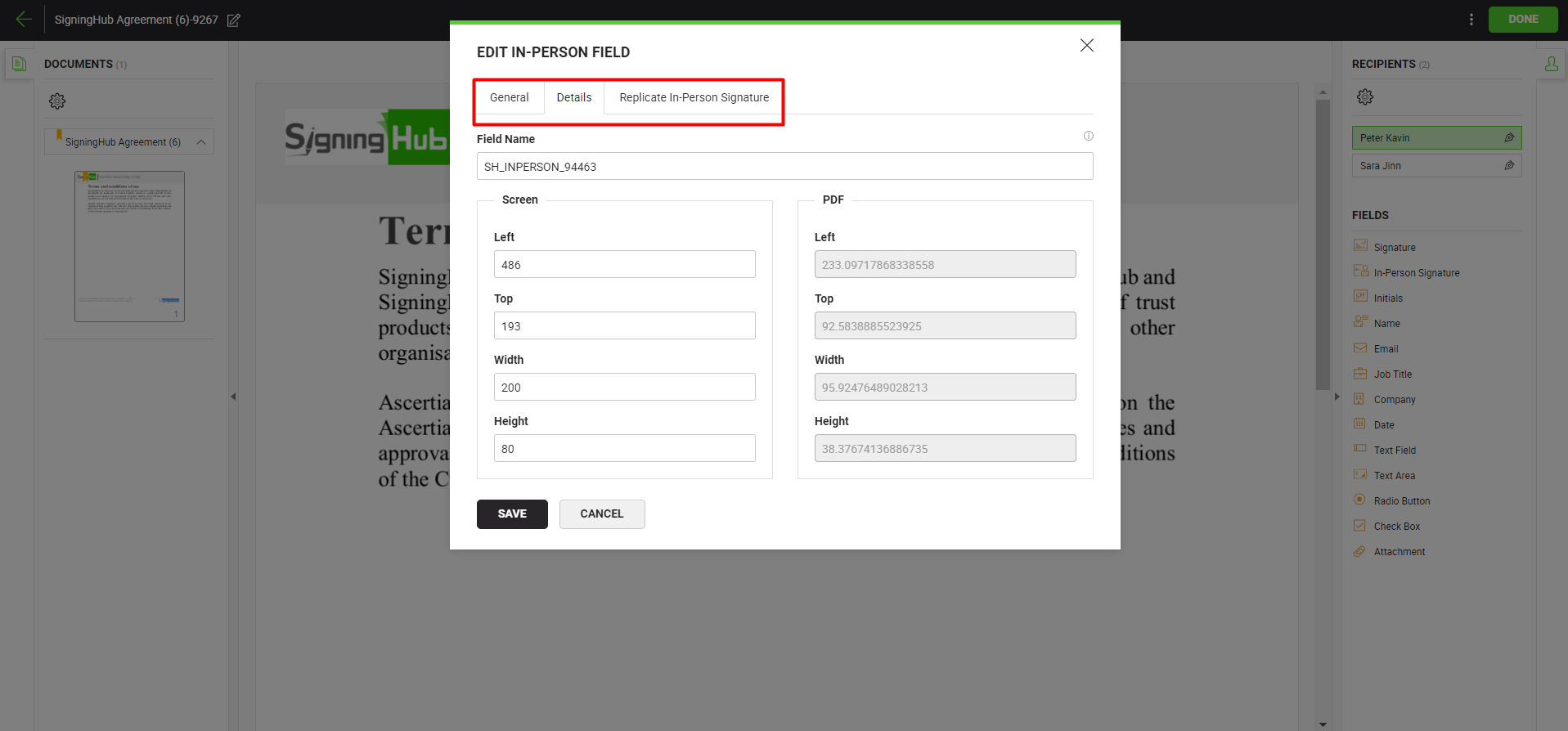 Use this tab to relatively set the on-screen and PDF coordinates/ position (Left, Top, Width & Height) of this in-person signature field. However you can also manually move the field to the desired position in a document through drag and drop, and these coordinates will be updated accordingly. These coordinates are only available as far as the status of a document is Draft.