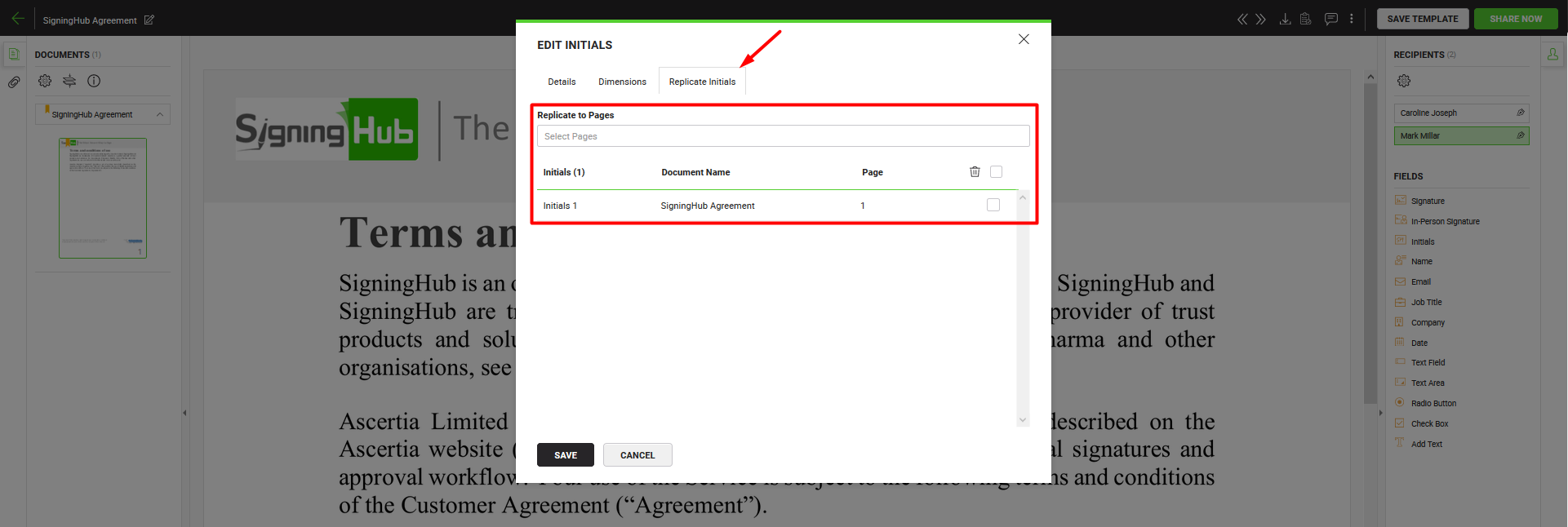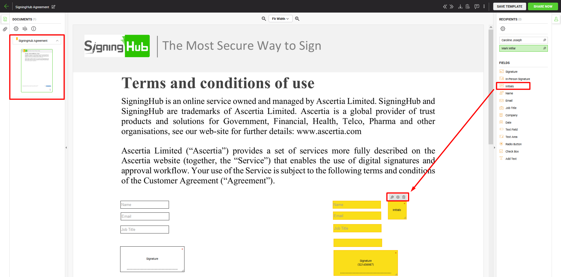 Using initials is almost the same as signing the document, however digital signatures are not embedded in this case. SigningHub lets you configure initials for all document recipients (i.e. signers, reviewers, editors, and meeting hosts. You can also add multiple initials fields against a recipient.