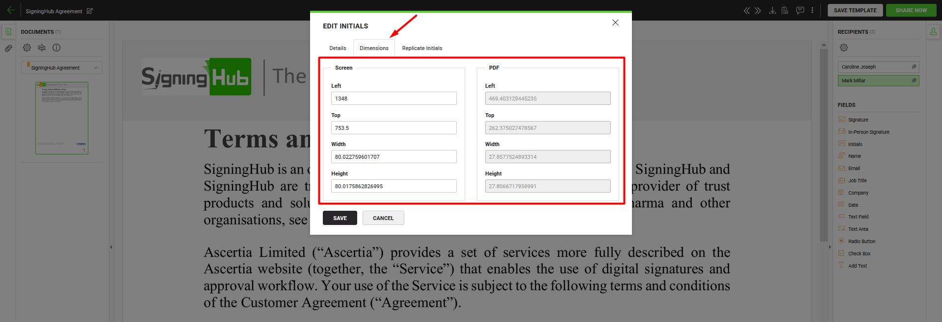 Use this tab to relatively set the on-screen and PDF coordinates/ position (Left, Top, Width & Height) of this initials field. However you can also manually move the field to the desired position in a document through drag and drop, and these coordinates will be updated accordingly. These coordinates are only available as far as the status of a document is Draft.