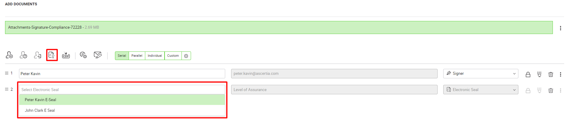 button from the header. and from the "Select Electronic Seal" drop down