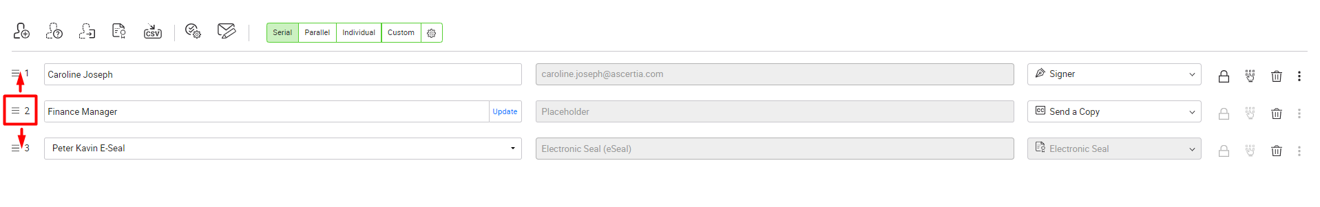 adjacent to your desired recipient/ electronic seal/ placeholder and move it up/ down in the list, as required.