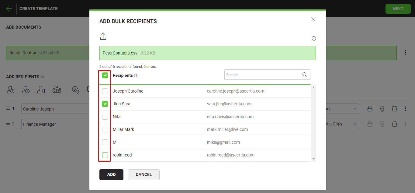 - All the recipients inside the CSV (with valid email addresses) will be listed in a dialog box for selection. Select your choice recipient(s) and click the "Add" button.