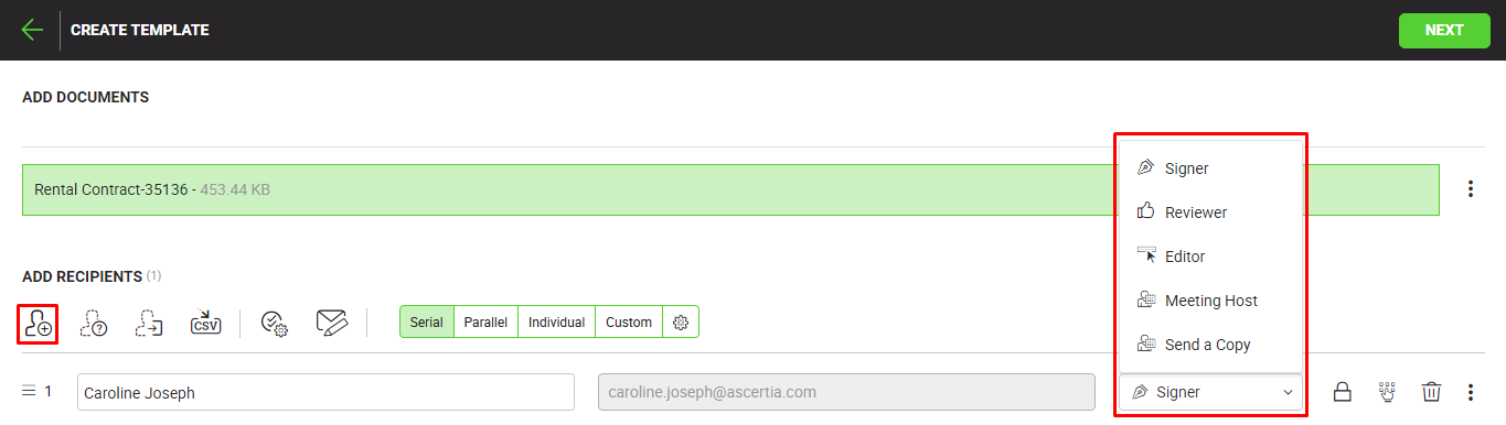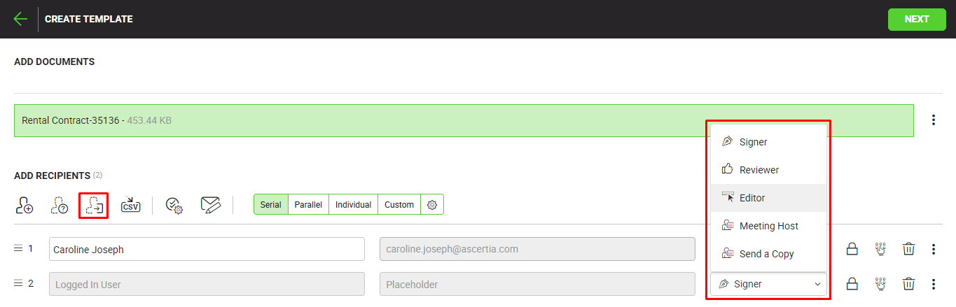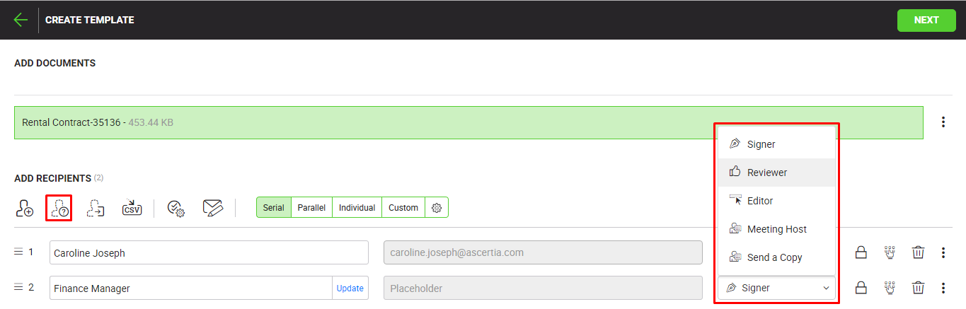 - The selected recipient(s) will be added in the template's recipients list. Now assign a role to each recipient from the immediate next drop down, i.e. Signer, Reviewer, Editor, Meeting Host, or Send a Copy. See the above "User Roles" table for details.