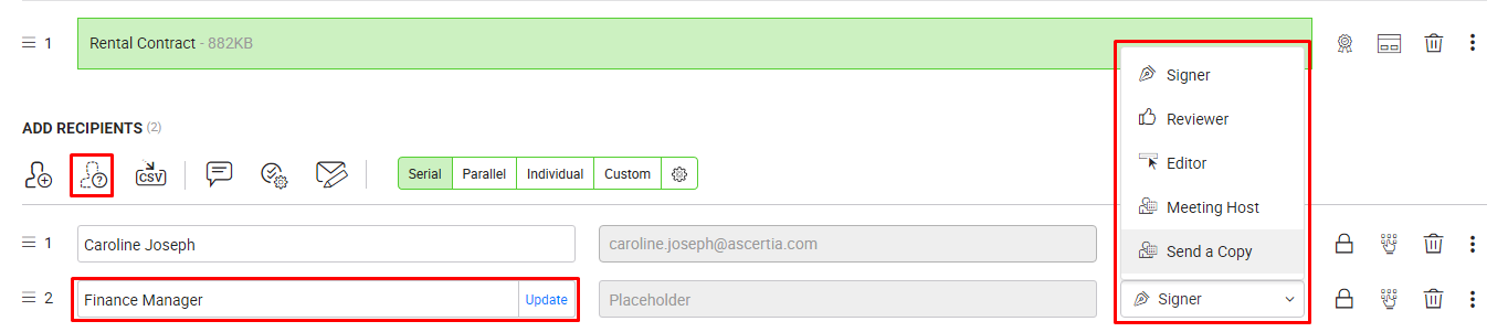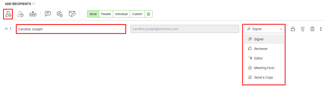 - Assign a role to the recipient from the immediate next drop down, i.e. Signer, Reviewer, Editor, Meeting Host, or Send a Copy. See the above "User Roles" table for details.