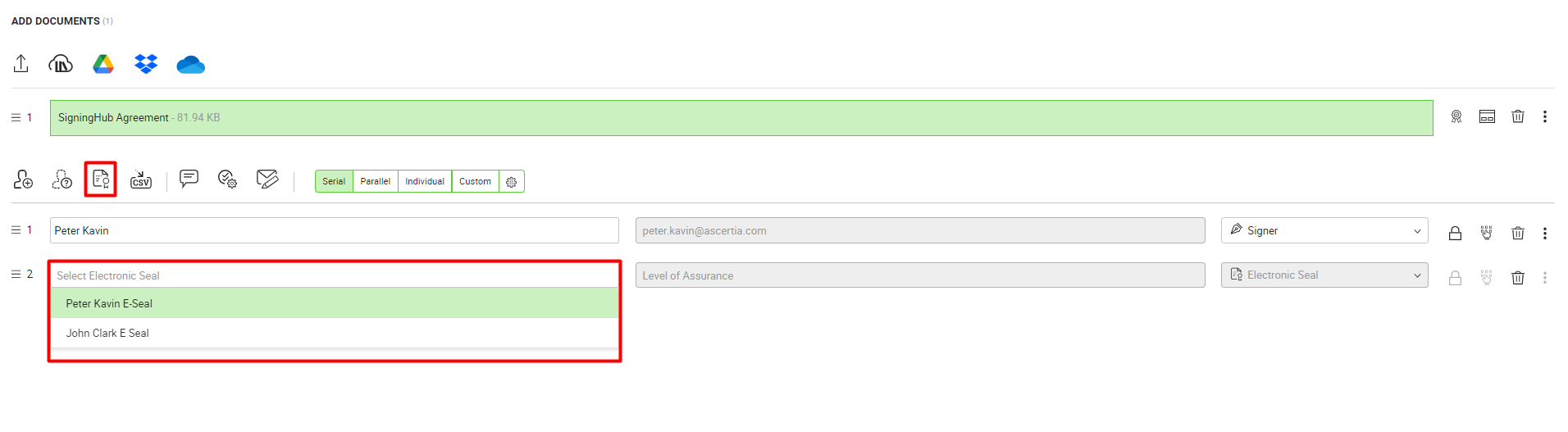 The option to add an electronic seal will only be available if an electronic seal has been configured in the enterprise settings, against the user role of the current user.