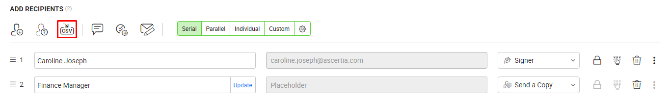 By default all the recipients, electronic seals and placeholders are added serially in a workflow. However, you can change their collaboration sequence after adding them, according to your document(s) approval flow. The set sequence is applicable to the serial workflows only. To change the sequence: