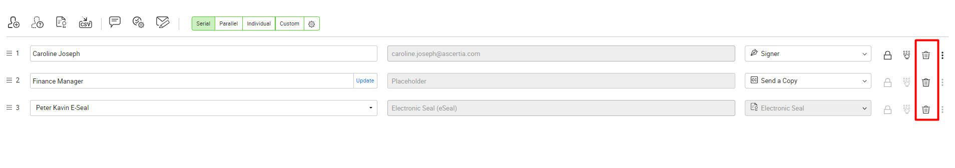 against the recipient/ electronic seal/ placeholder, which you want to delete from the list.