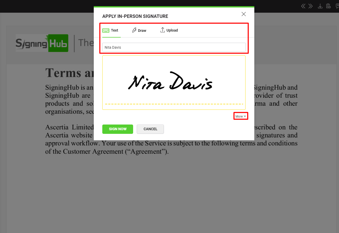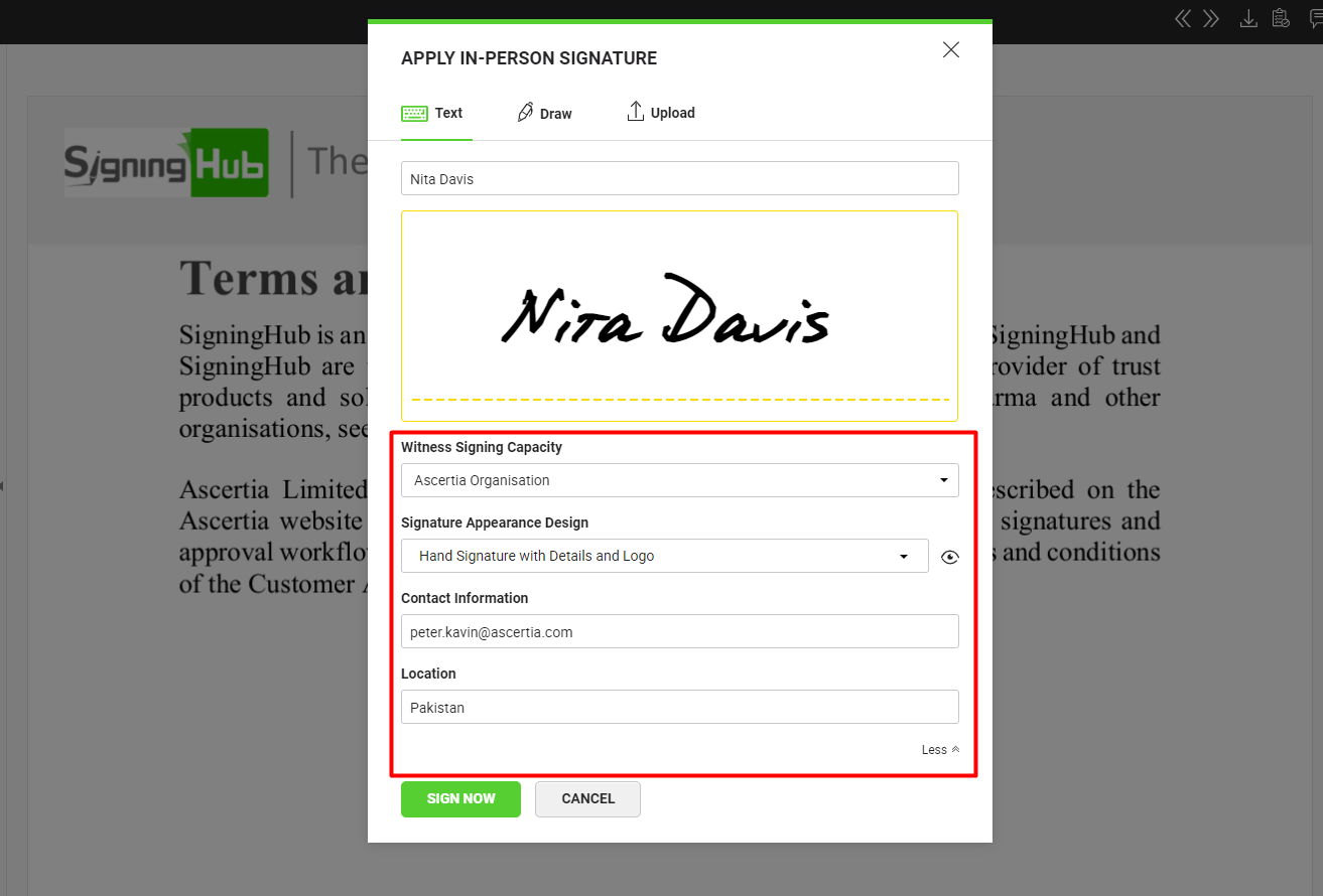 - Click the "More" option to select a signing capacity, signature appearance design, contact information and location. The signing capacities for the In-Person signature field will match with the configured "Level of Assurance" for the field, by the document owner.