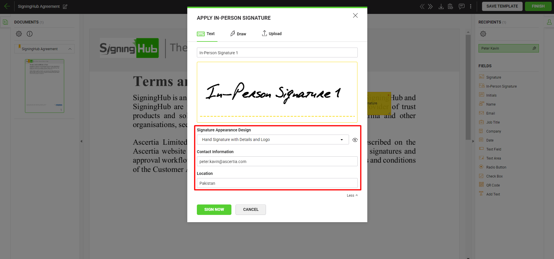 - Click the in-person field. A dialog window will appear, here select the in-person type (i.e., Text, Draw, Upload or Signature Pad) to sign the field accordingly. In case of uploading a signature image, the white color in the image background will be auto converted to transparent. For more details on performing initials using a Signature Pad, see here.
