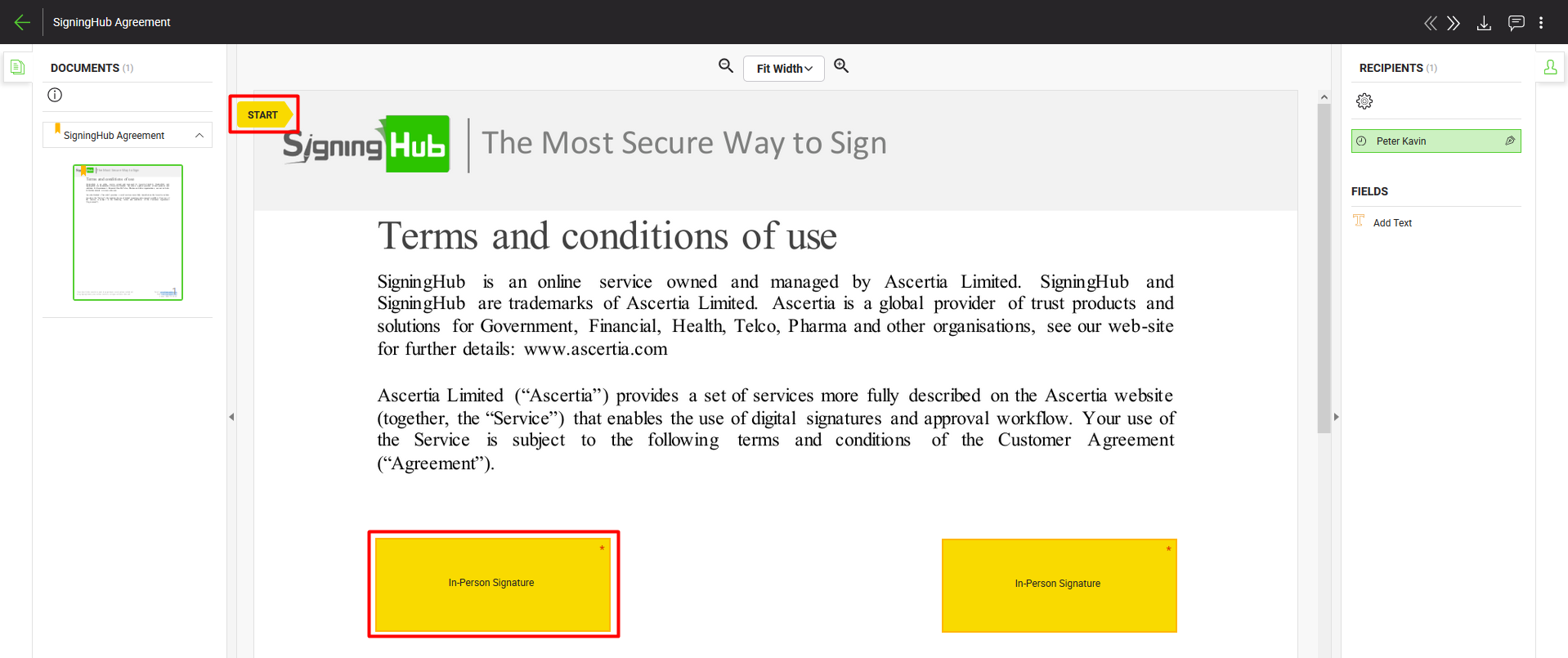 - Click the "Start" pointer (highlighted in screenshot) to begin adding your in-person signatures. The cursor will start blinking in the first in-person field in yellow-orange color.