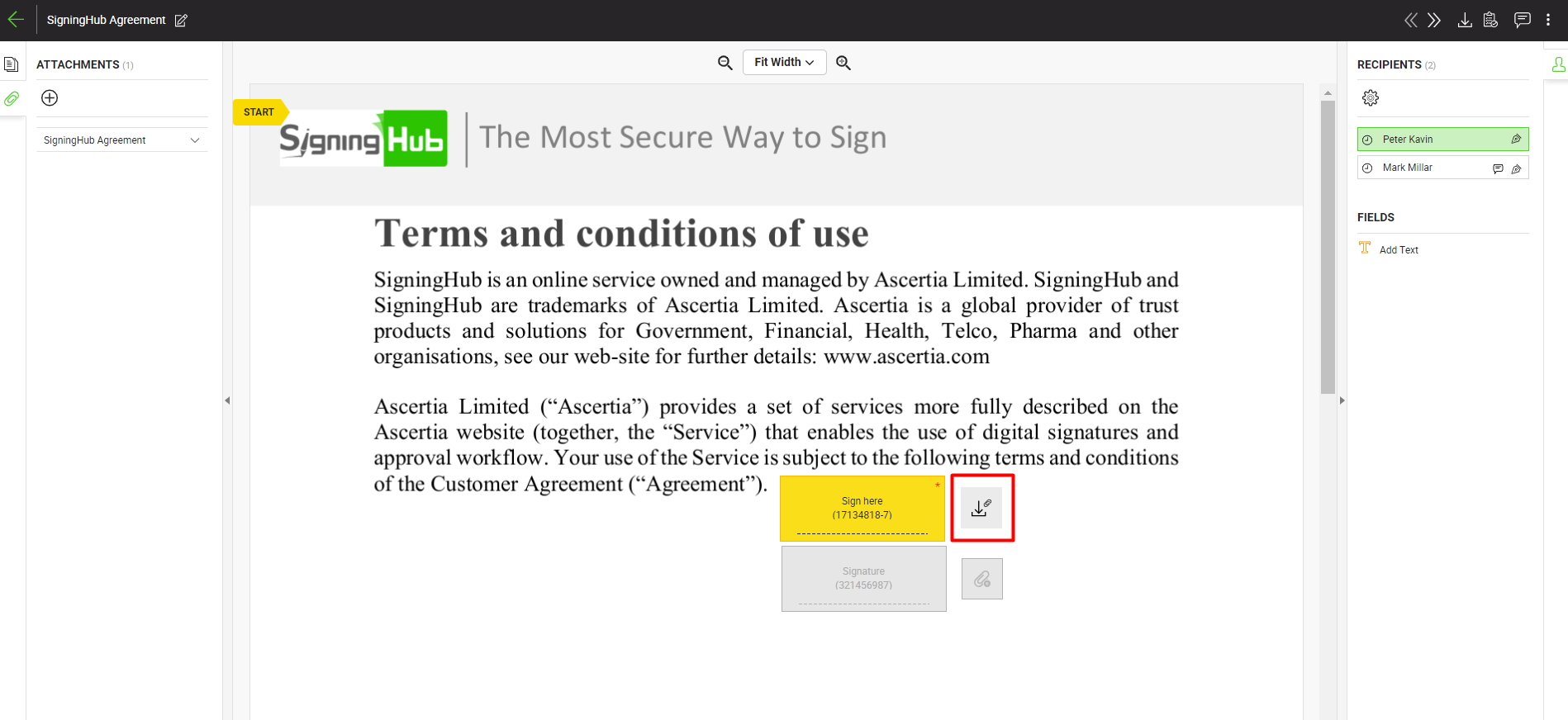 When you receive a document with attachment fields assigned to you, then you need to add attachment to these fields, as required by the document owner, before signing. This is to ensure that you have provided all the required attachments that are requested by the document owner. If the attachment field is compulsory, you will only be able to sign the document after you have added an attachment to the attachment field.