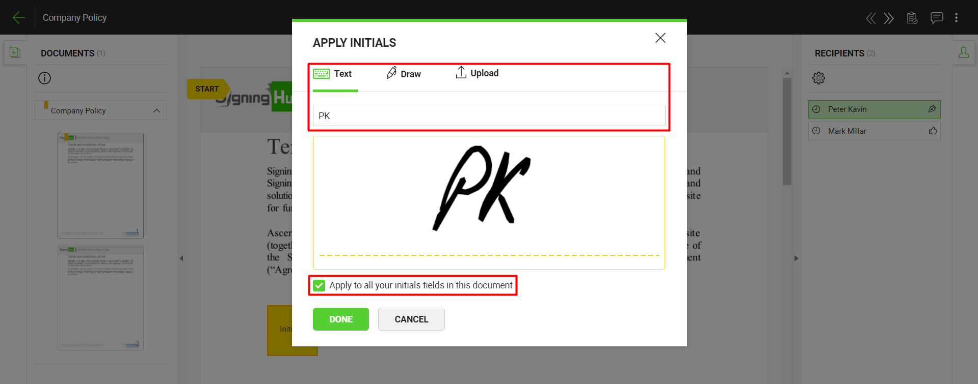 - Click the initials field. A dialog will appear, select the initials type (i.e., Text, Draw, Upload or Signature Pad) and specify your initials accordingly. For more details on performing initials using a Signature Pad, see here.