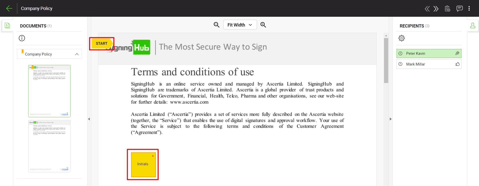 The specified initials will be added and displayed on the respective area(s) of the document. The system wont let you sign the document, unless you add your initials in all the assigned fields. Also you cannot fill in the initials fields which have been assigned to someone else.