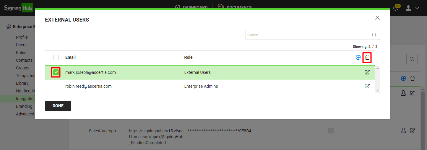 - A dialog will appear to manage the external users for this integration. Select the external user(s) to delete and click