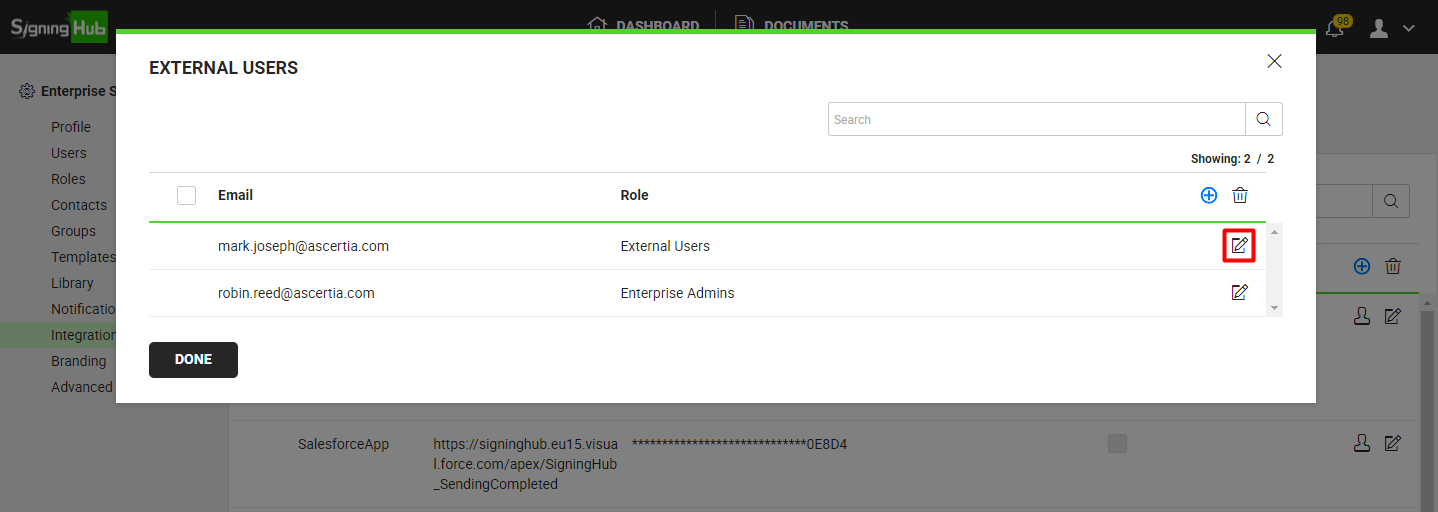 - A dialog will appear to manage the external users for this integration. Search/ move to the external user to edit and click