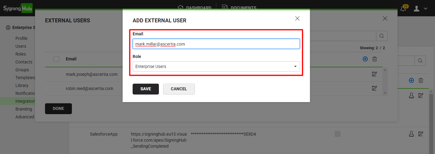 In other words, if an Enterprise A requires their documents to be signed by the users of Enterprise B or guest users within an integrated app environment (i.e. Salesforce, SharePoint, MS Dynamics CRM, etc.), then they can assign a default or specific user role to these (external) users, to implement their (Enterprise A) signing policy on such users.