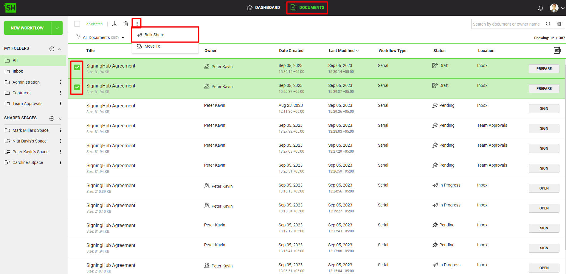 SigningHub provides an efficient, fast and easy way to share a pile of Draft documents (up to 50) in one go. For this, you can use the "Bulk Share" option to send off multiple documents (in the "Draft" status) through a single click operation.