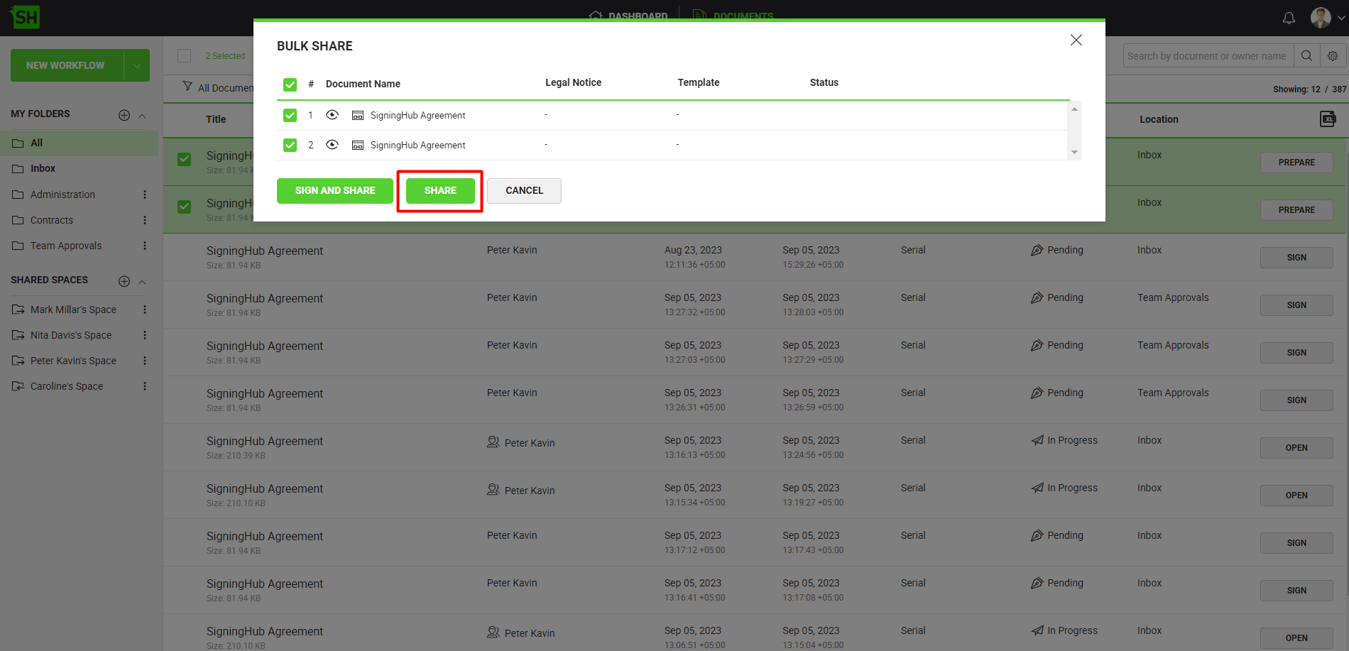- Click the "Share" button to send off all the documents.