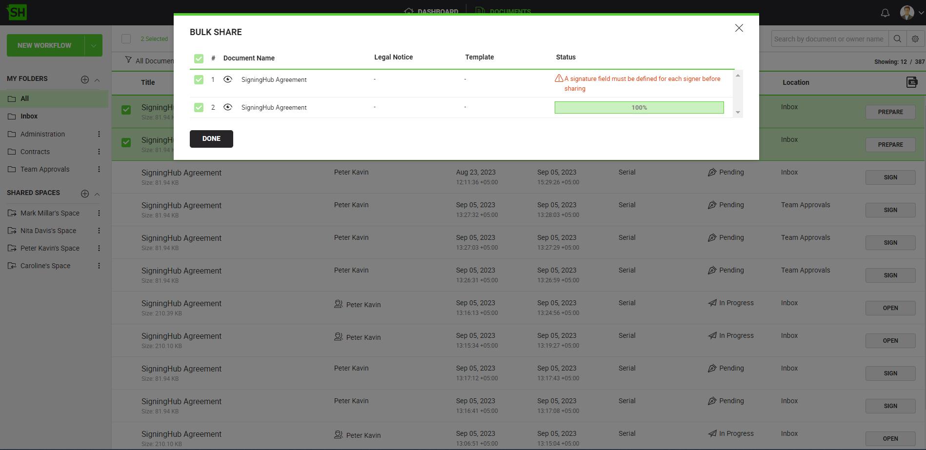 - The documents will be signed and shared right away and their statuses will be displayed. In case a document could not be signed or shared, the respective reason will be displayed accordingly. Click "Done" to conclude the process.