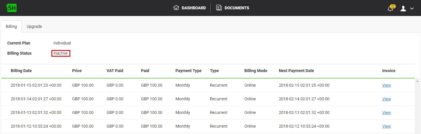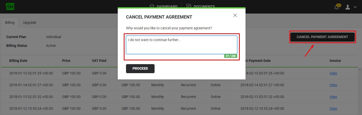 - A dialog will appear to specify reason of cancellation. Specify the reason and click the "Proceed" button. The payment agreement will be cancelled and your billing status will become "Inactive" as shown below.
