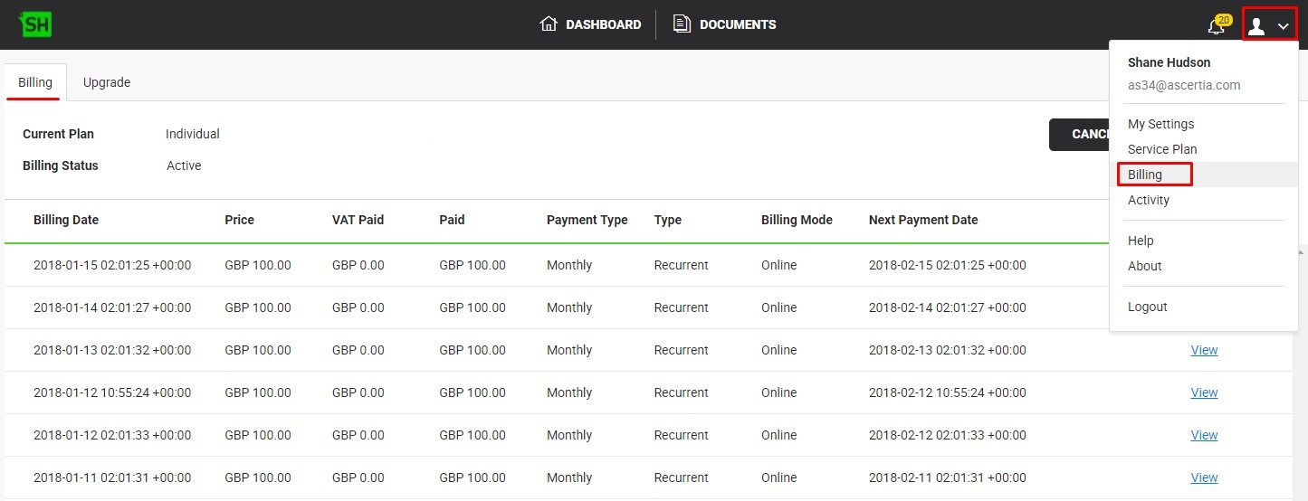 The "Cancel Payment Agreement" option is only available for the Pay Regularly plans. You may cancel your payment agreement with SigningHub anytime, even after buying a service plan. In this way, SigningHub will immediately terminate all your next scheduled payments, however you can still enjoy SigningHub services till the Next Payment Date is not reached. The cancel payment option is only available to the users who have "Enterprise Billing" option enabled against their user role.