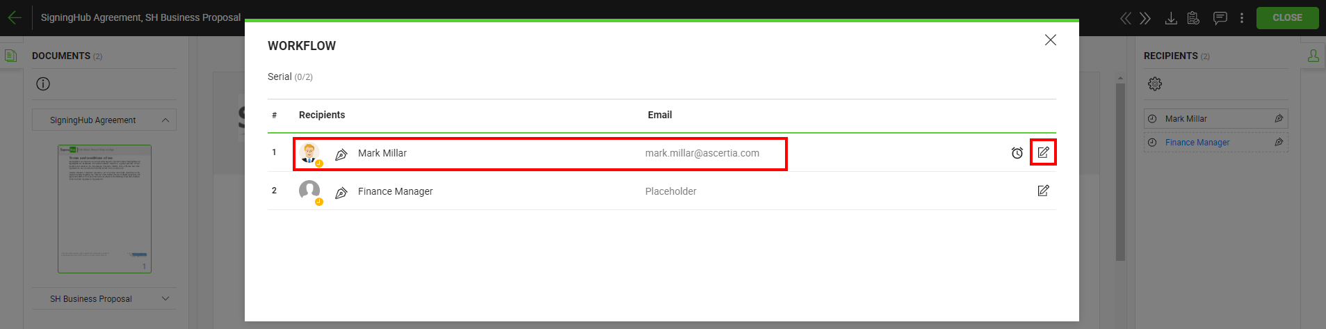 SigningHub allows you to change the workflow recipients even after sharing the document, provided it is allowed in your role. You can change all those recipients who have not collaborated (signed/ reviewed/ updated/ hosted the in-person signatures) in the workflow yet. Similarly, you can also update the placeholder fields with the actual recipients.