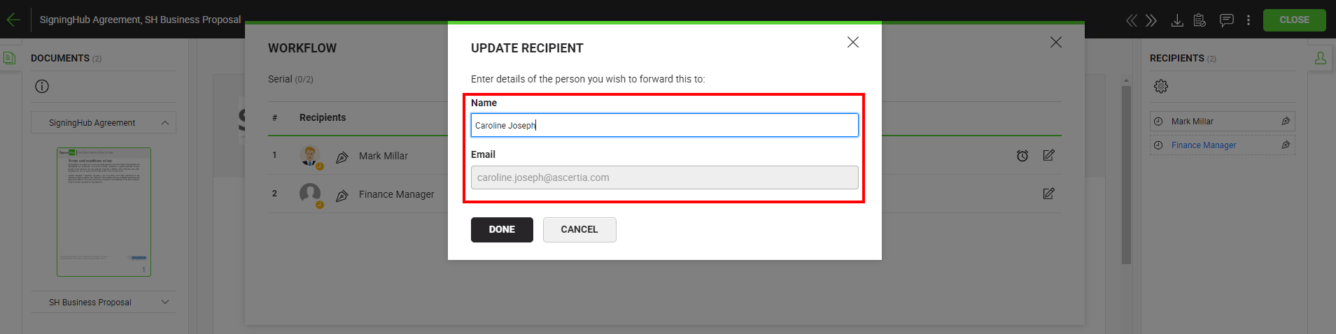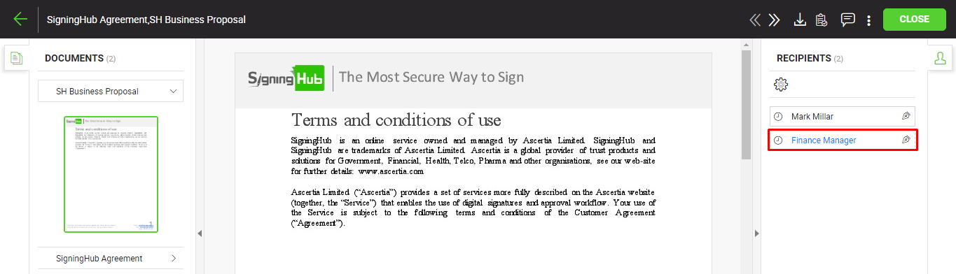 - The shared document will be recalled from the previous recipient's account, and s/he will be notified through an email/SMS by SigningHub.