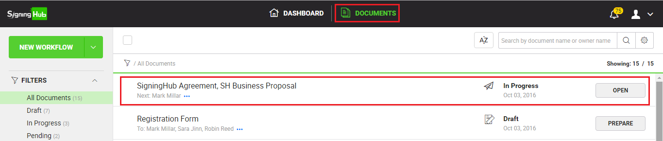 - Click the "Documents" option, available at the top of the SigningHub screen.