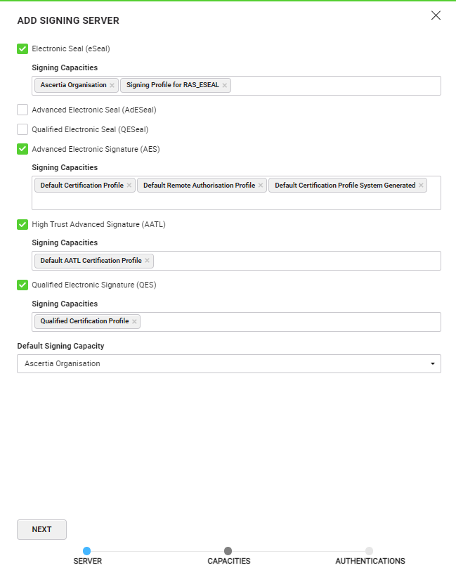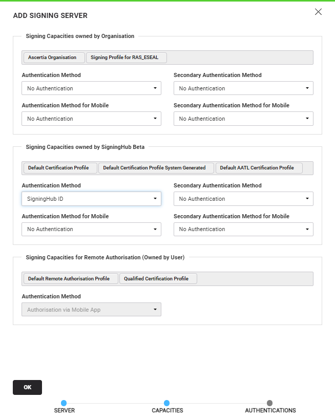 Select this option as the Authentication Method to allow your enterprise users to use remote authorised signing provision. This option will only appear for the capacities that has Qualified Electronic Signature (QES) configured as the level of assurance and appears under 'Signing Capacities for Remote Authorization (Owned by User)' category.