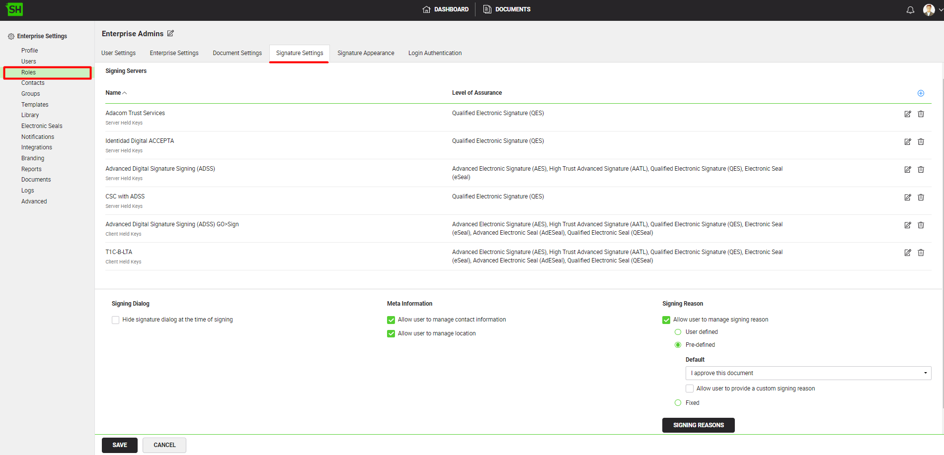 Signature settings are all about configuring the allowed signing methods (i.e., Server-side Signing, Client-side (Local) Signing, and/or Mobile Signing), authentication methods (i.e., No Authentication, OTP via SMS, SigningHub ID, Microsoft Active Directory, Salesforce, Freja eID etc.) and signing capacities in a role. You can separately configure these settings for web browsers and mobile apps, and choose a default signing method for each case.
