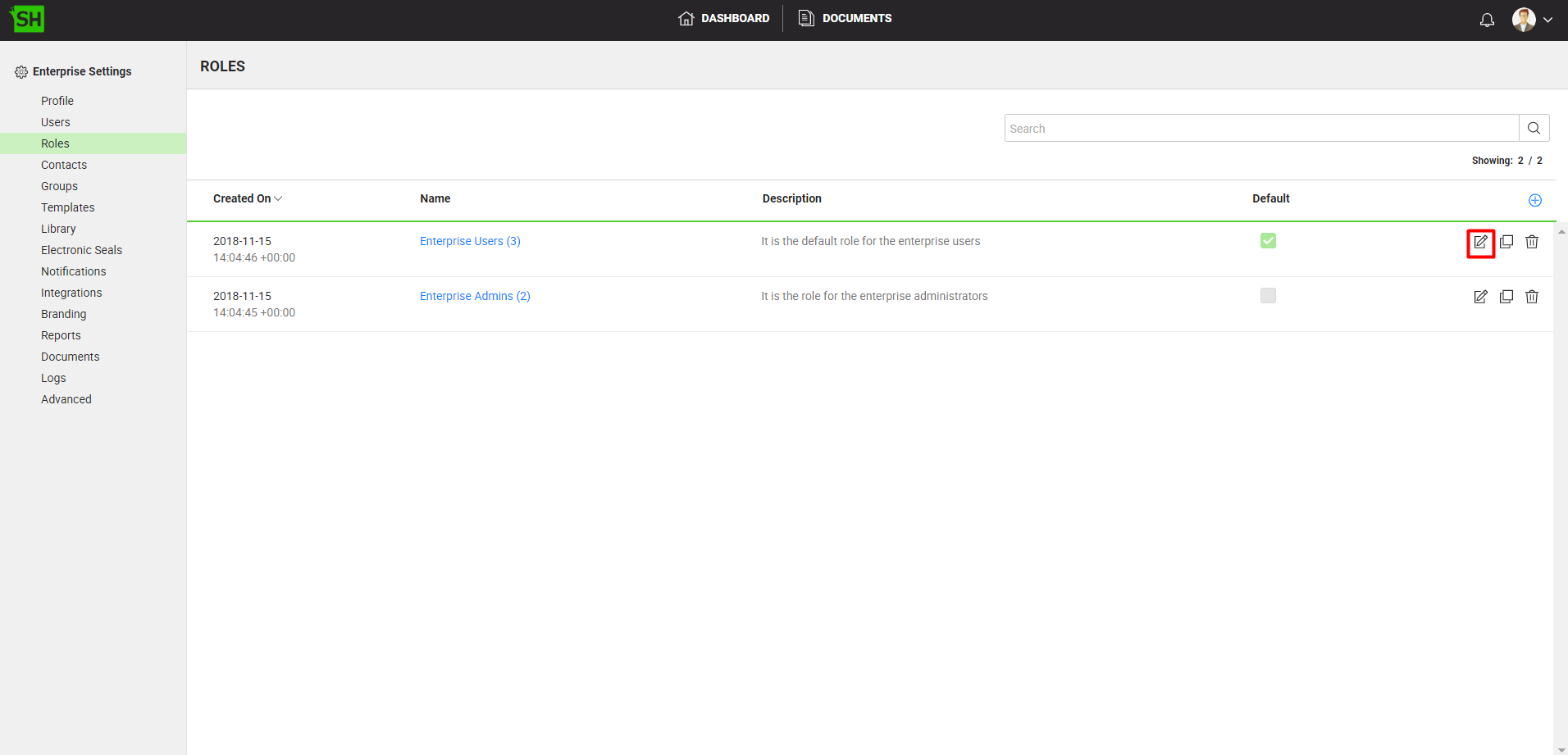 Select this option to allow the delegated signing feature in a role. This will enable the "Delegated Signing" tab under the "My Settings" option for your enterprise users belonging to this role. |