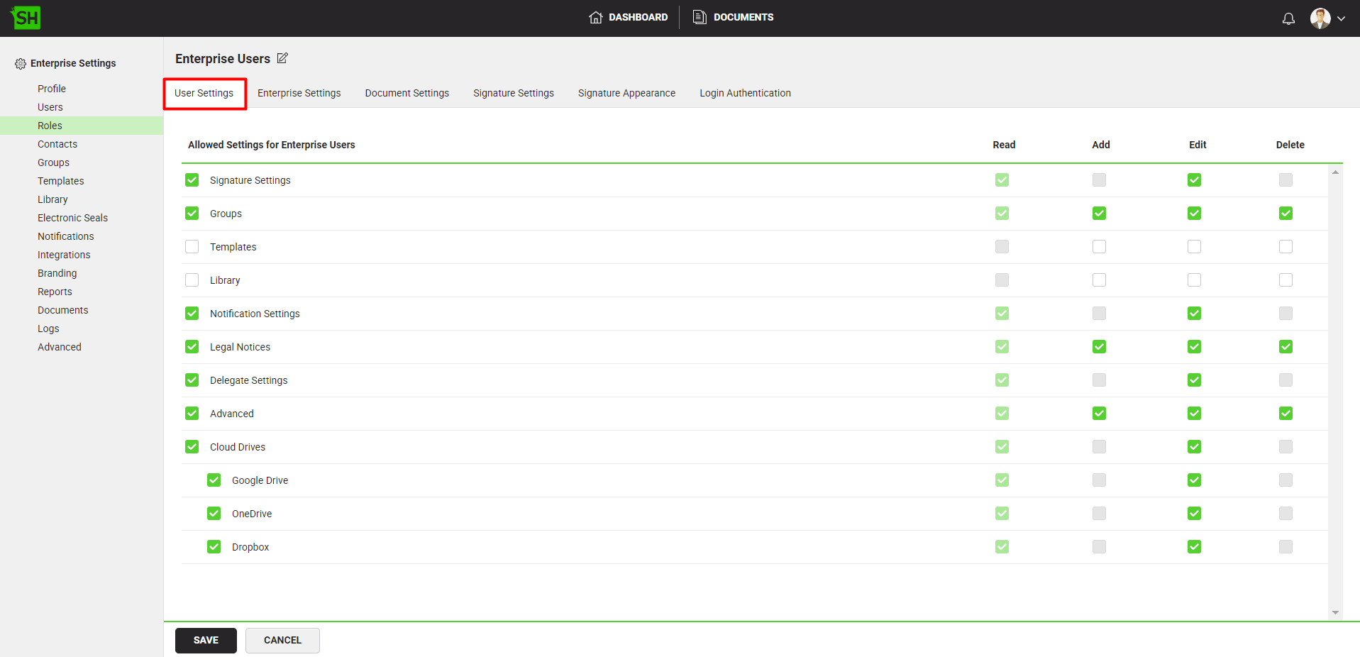 Select this option to allow the cloud drive configuration access in a role. This will enable the "Cloud Drives" tab under the "My Settings" option, and the "Get from Cloud" option on Document adding screen, for your enterprise users belonging to this role.