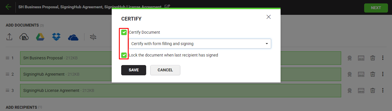 - Tick the "Lock the document when last recipient has signed" checkbox, if you want to lock all the form fields of your document after the last signature. Document locking feature is specifically related to the PDF documents with form fields. This checkbox will be disabled when "Certify with no changes" option is selected from the above drop down.