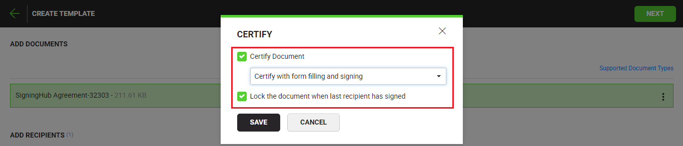 SigningHub lets you certify your digital signature. The certified signature is used to restrict the recipients to perform only the specific changes in a document, as system wont allow them to perform any other changes.
