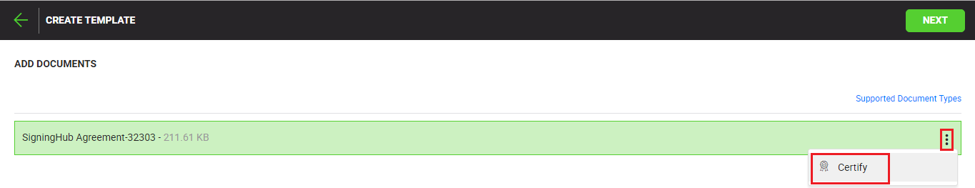 - Click the "Certify Document" option, and choose the required certification preference from the next appearing drop down. For details, see the "Certify Options" table above.