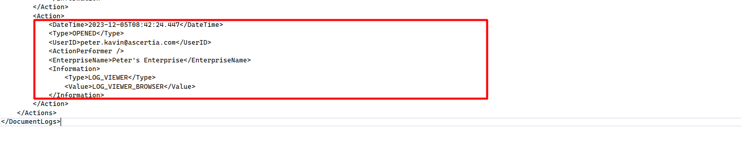 - The red highlighted portion depicts all the performed actions on the document that have been logged in the form of action tags. You can expand any action tag to view its associated details. For example, the highlighted action shows the "Date Time" on which action was performed, the "Type" of action, the "User ID" who performed the action, the "Enterprise Name" to whom user belongs, the "Information Type & Value" through which (medium) document was accessed.