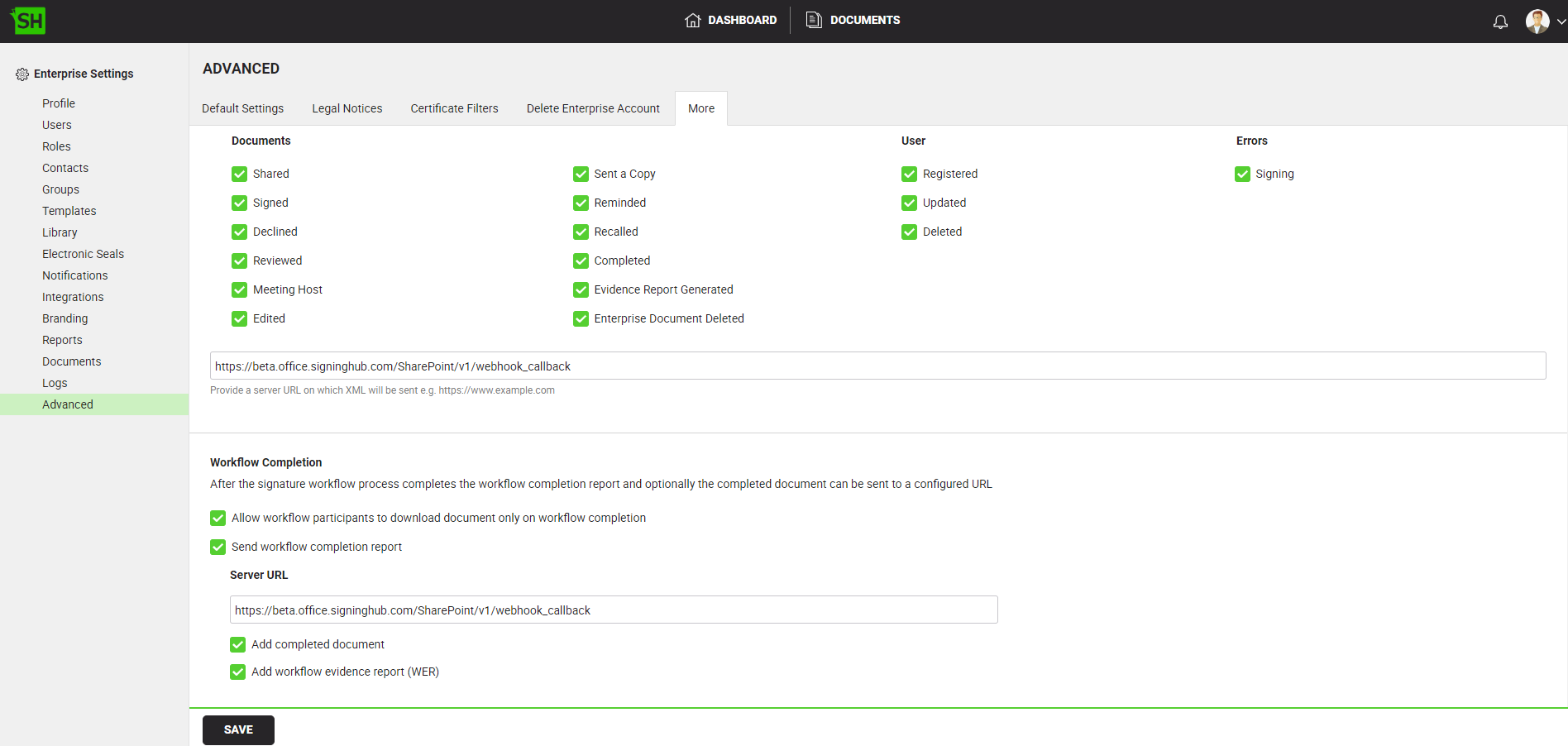 Webhooks and the Workflow Completion Report are configured in the document owner's enterprise settings