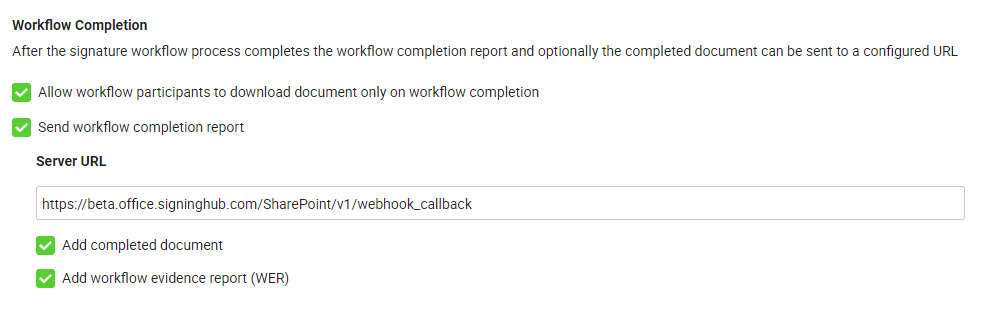Send workflow completion report Select to automatically post the workflow reports (in XML format) to the configured address when the workflow completes. This applies to all users within your enterprise. When enabled, the "Server URL" and "Add completed document in report" fields are displayed as shown in the image below.