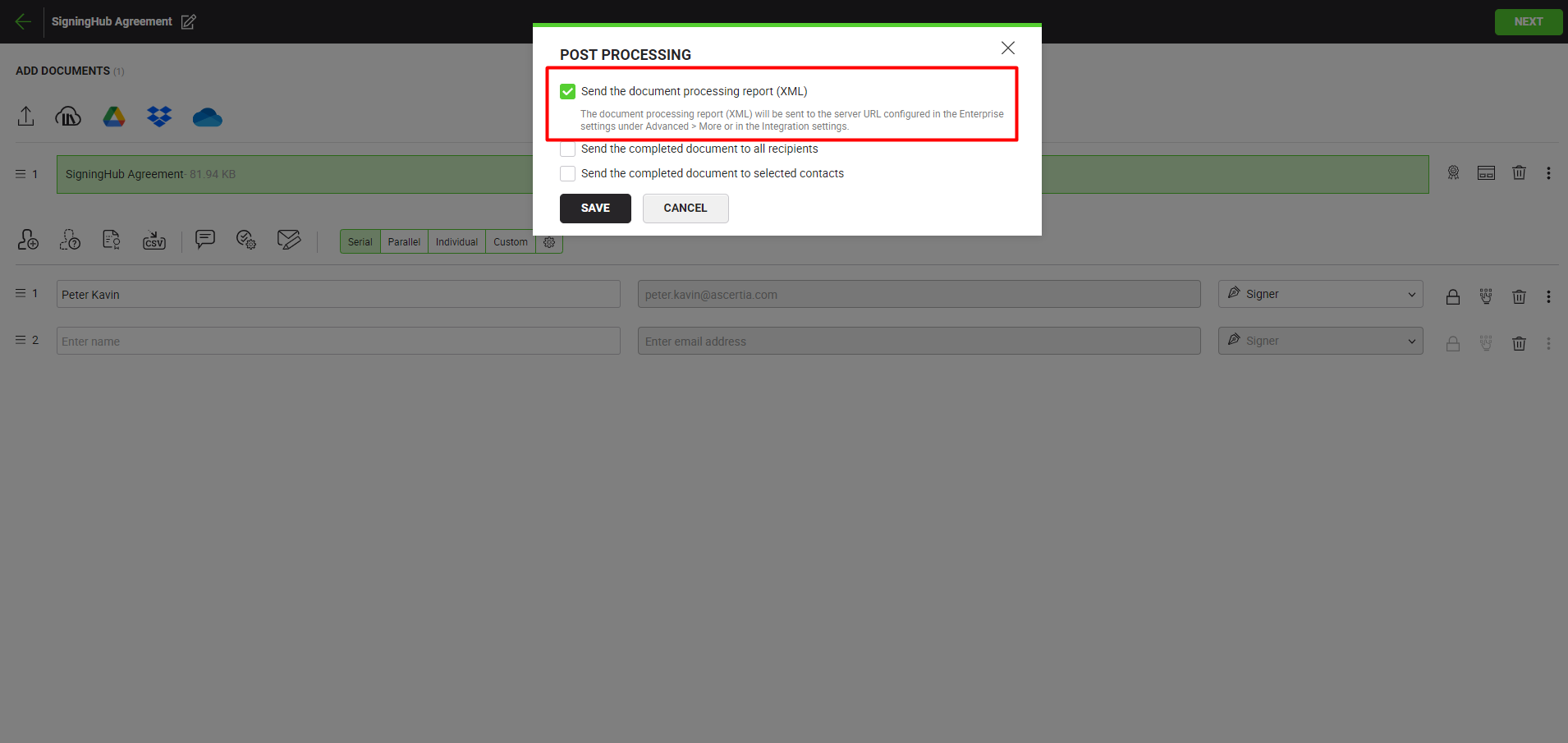 Check the below checkboxes for when you want the system to send a document processing report (XML) to the provided server address.
