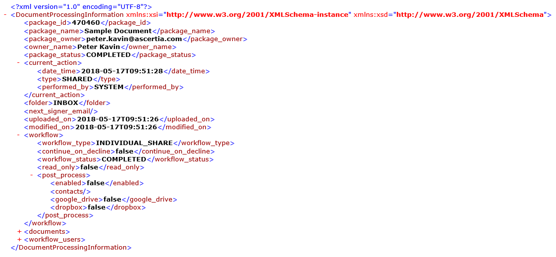 The XML of document processing report is composed of a header and all the workflow related actions that have been performed on the document, i.e. Shared, Signed, Reviewed, Edited, Carbon Copied, Recalled, Declined, Completed, and Deleted. A sample XML that is published on server is shown below: