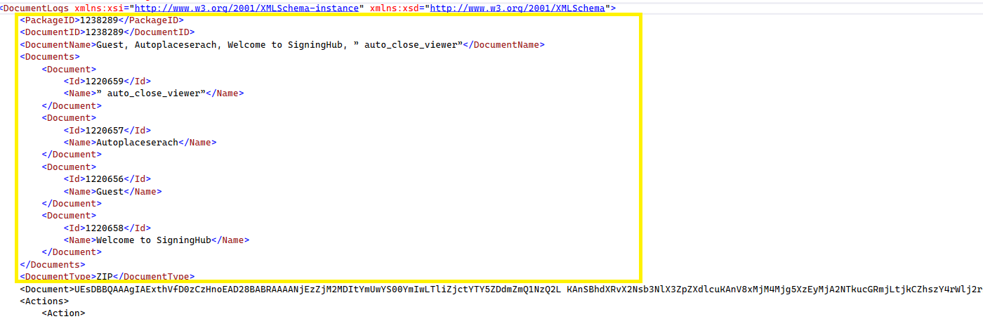 - The yellow highlighted portion depicts the XML header, which displays the "Package ID", "Document ID", "Document Name", "Documents", "Document Type", and "Document" information. However, the "Document" tag is optional and displays the base 64 encoded bytes of the document.