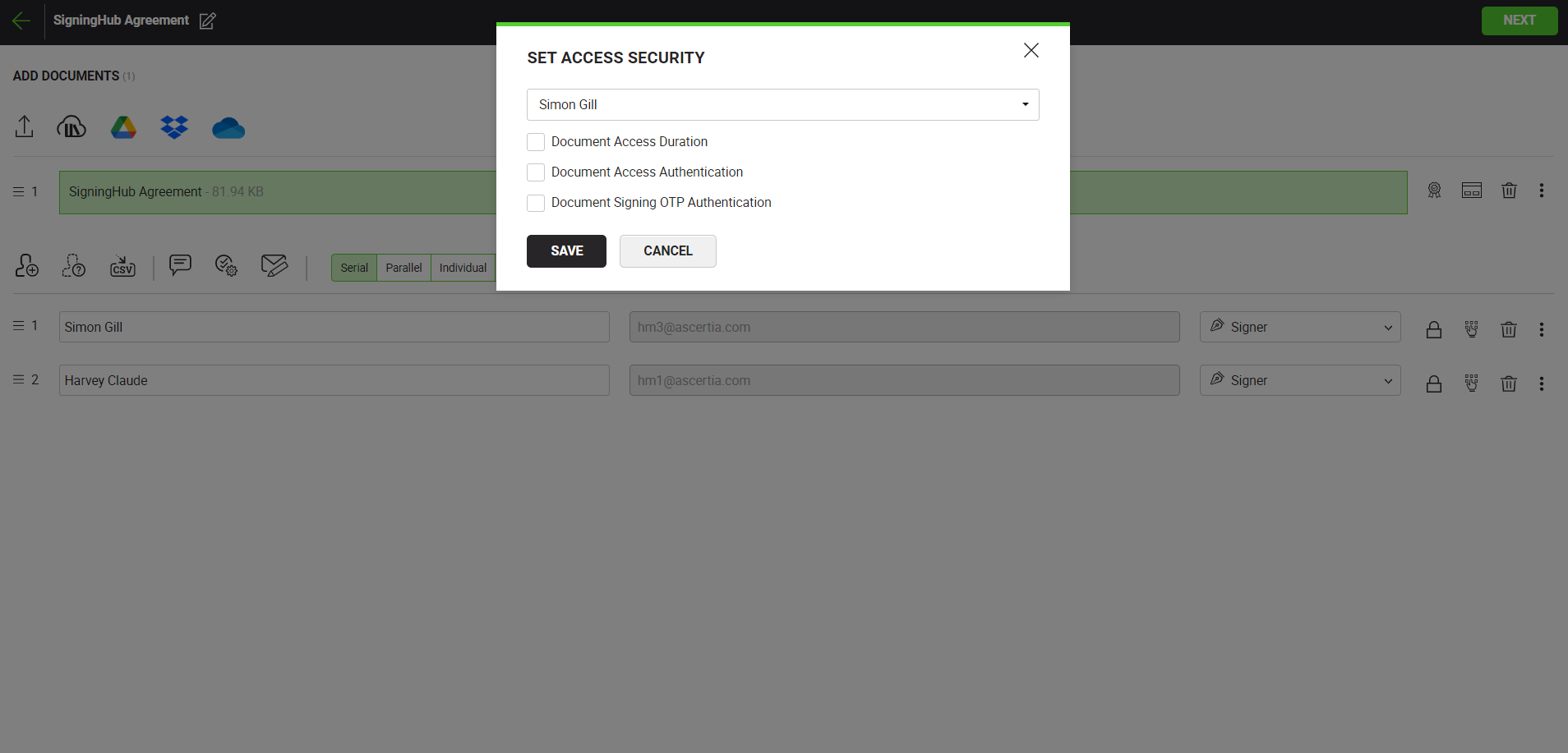 Considering the screenshot scenario, an OTP will be sent to the email address and specified mobile number of "Simon Gill", whenever he attempts to sign the document. He must provide the received OTP to sign the document.