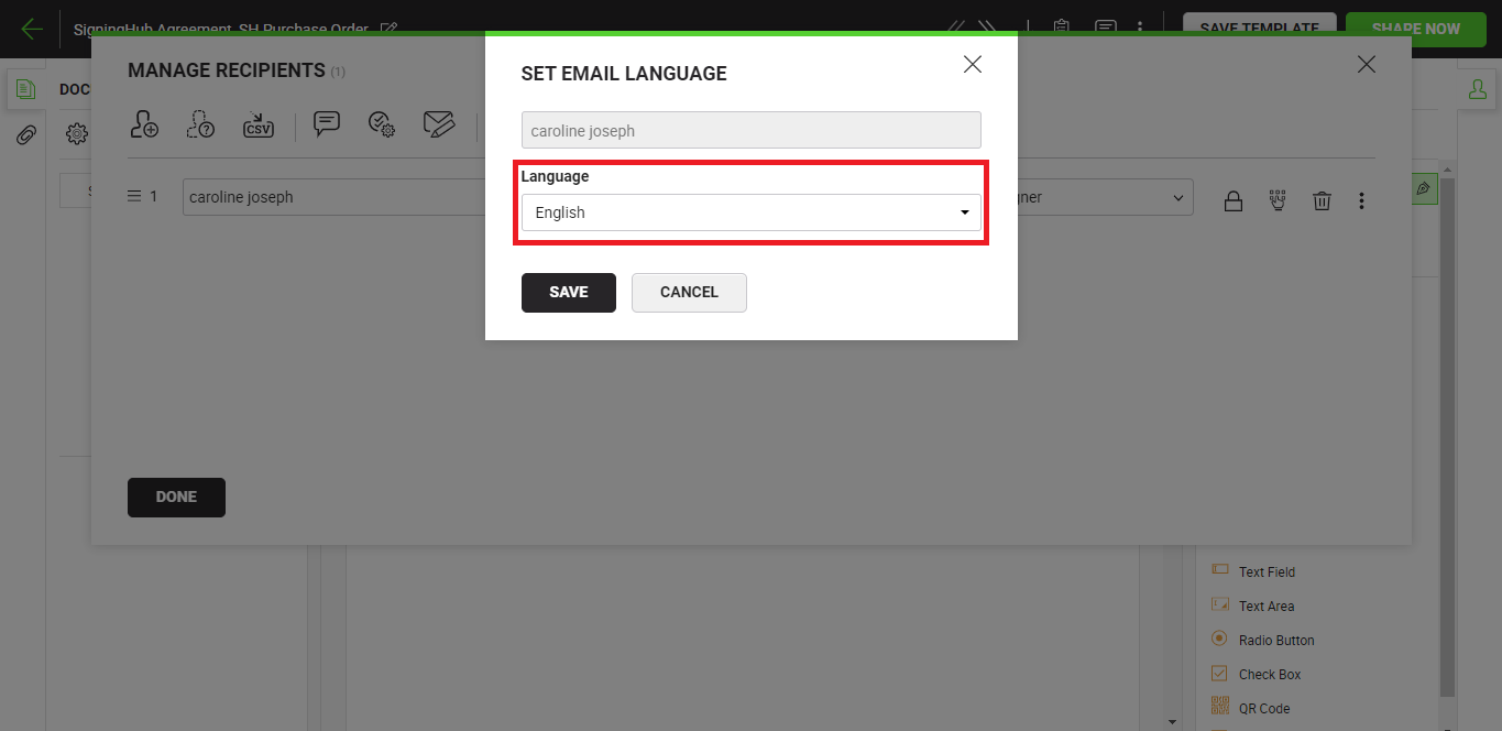 Considering the screenshot scenario, SigningHub will send emails in selected language to "Caroline Joseph" for Document Shared, Sign-off Reminder, Document Recalled, and Send a Copy.